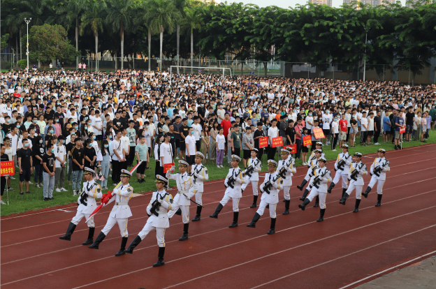 国旗护卫队的队员们迈着整齐的步伐,昂首挺胸,护送国旗入场
