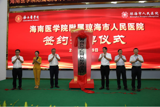 琼海市副市长程江洪,琼海市卫健委主任甘雷,海南医学院党委副书记、校长杨俊,党委委员、副校长张彩虹,党委委员、研究生院院长王慷慨等领导共同为“海南医学院附属琼海市人民医院”揭牌