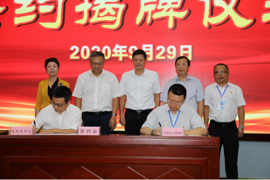 在现场全体人员的共同见证下,党委委员、研究生院院长王慷慨,党委副书记、院长王立分别代表海南医学院与琼海市人民医院签署协议。琼海市副市长程江洪,琼海市卫健委主任甘雷,海南医学院党委副书记、校长杨俊,党委委员、副校长张彩虹,党委委员、研究生院院长王慷慨等领导共同为“海南医学院附属琼海市人民医院”揭牌。