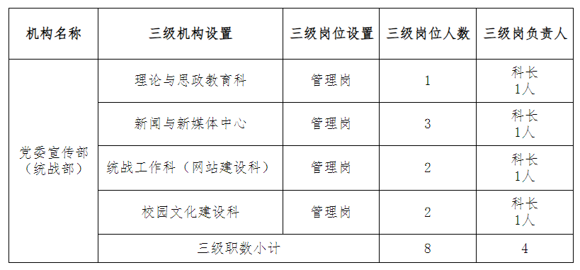 党委宣传部(统战部)为学校党委工作部门,归口管理全校宣传思想文化和统一战线工作,具体负责意识形态工作、新闻舆论工作、校园及网络文化建设工作,牵头协调全校思想政治、精神文明建设和法制教育等工作,以及民主党派、无党派、党外知识分子、港澳台、侨务、民族和宗教等工作。根据职能,拟设置三级机构4个,分别为:理论与思政教育科、新闻与新媒体中心、统战工作科(网站建设科)、校园文化建设科。