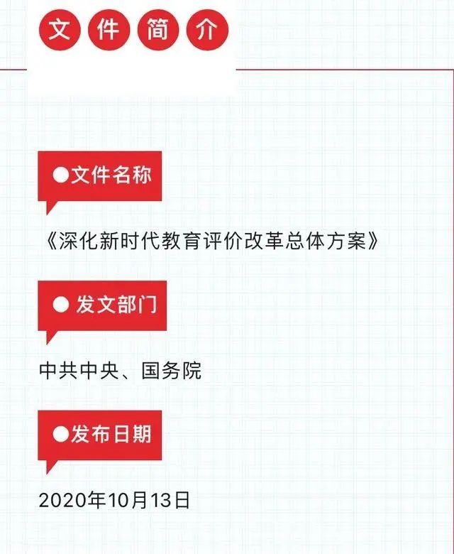 2018年10月,在全国教育大会上,习近平总书记强调:“要扭转不科学的教育评价导向,从根本上解决教育评价指挥棒问题”。为深入贯彻落实习近平总书记关于教育的重要论述和全国教育大会精神,坚决破除“唯分数、唯升学、唯文凭、唯论文、唯帽子”的顽瘴痼疾,提高教育治理能力和水平,加快推进教育现代化,2020年10月,中共中央、国务院印发《深化新时代教育评价改革总体方案》(以下简称《方案》)。