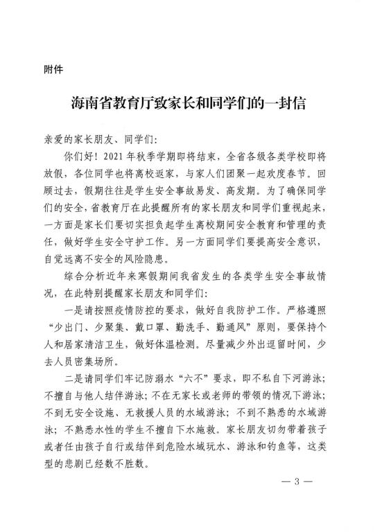 海南省教育厅关于印发《海南省教育厅致家长和同学们的一封信》的通知