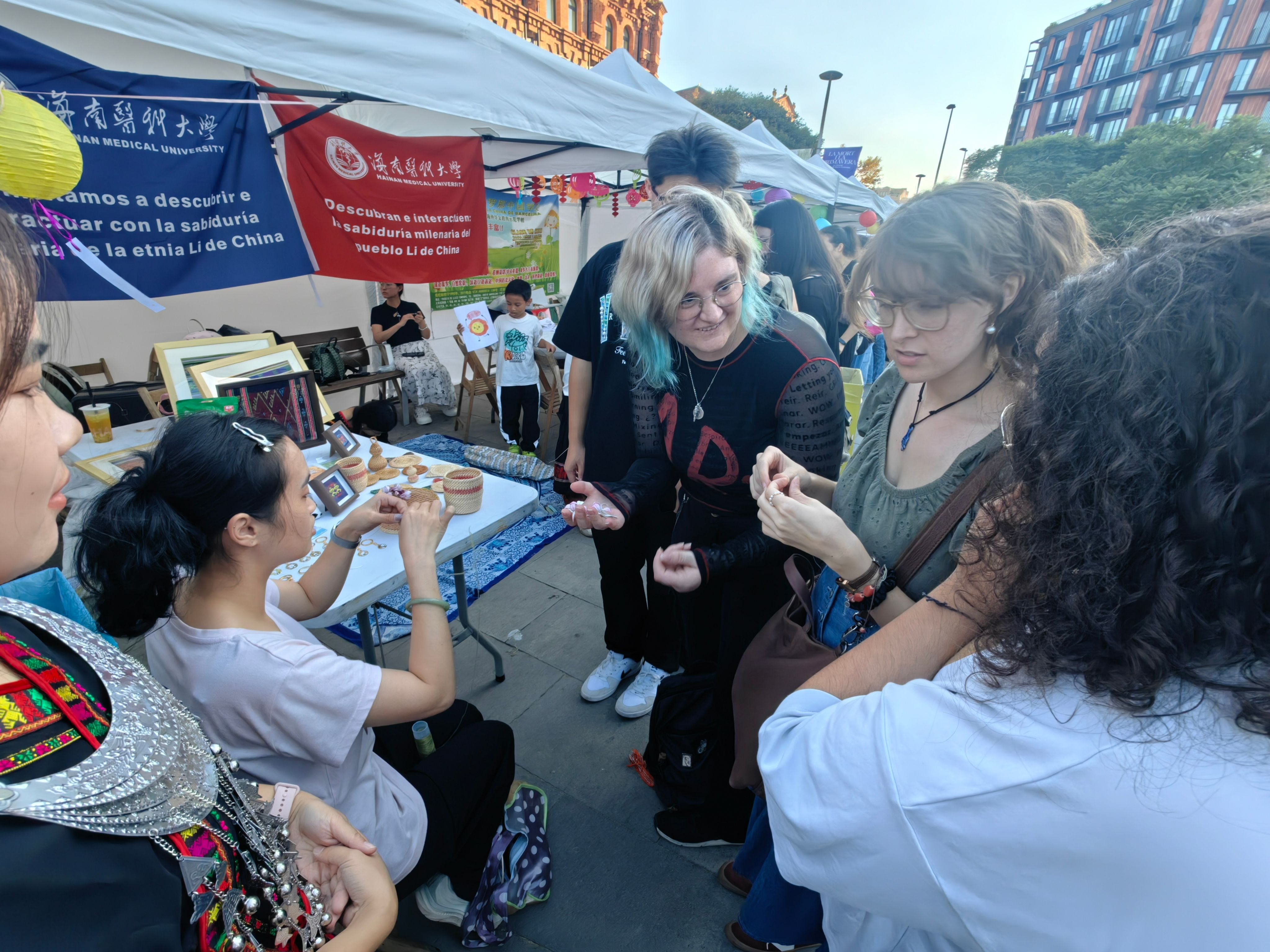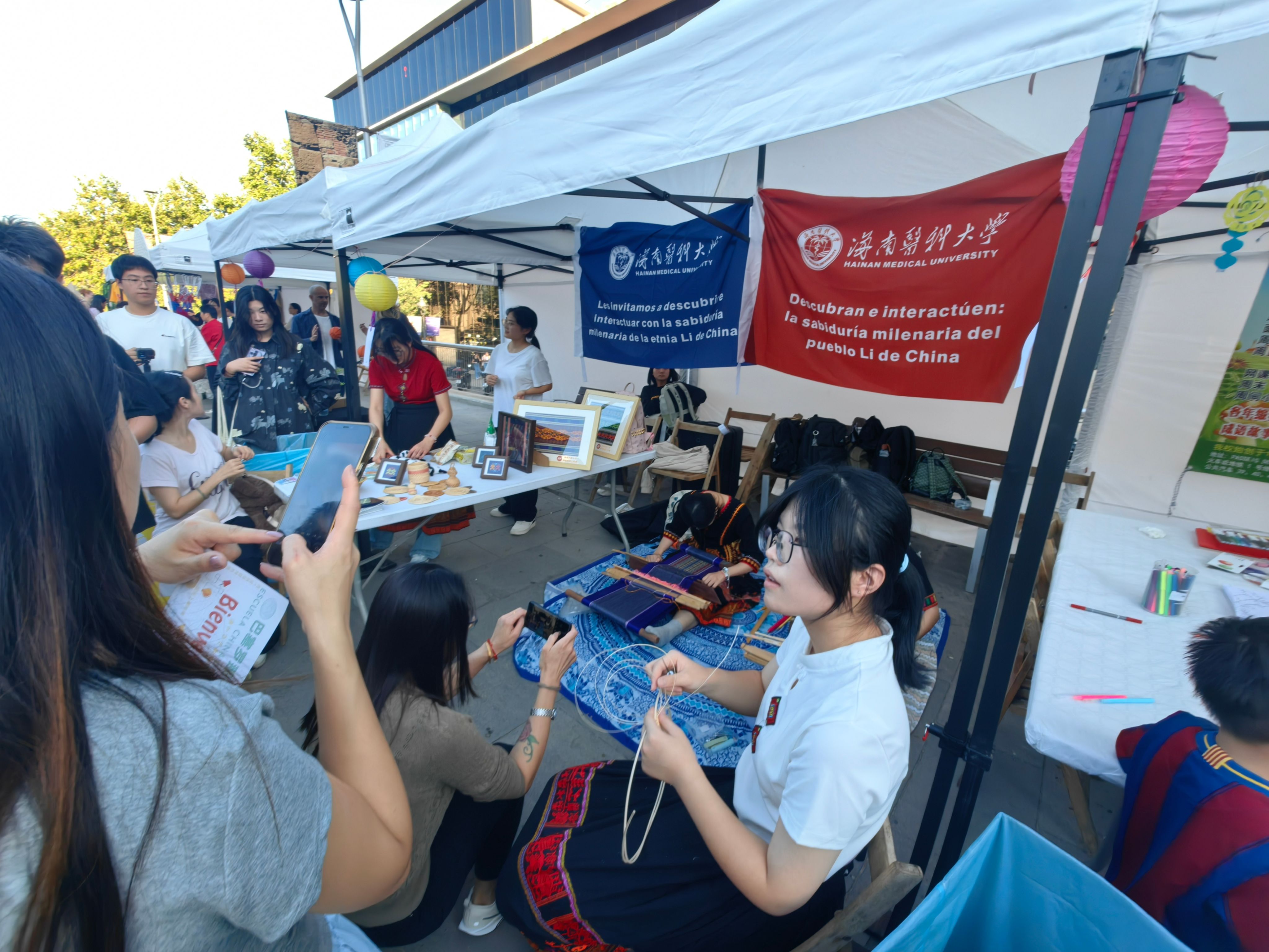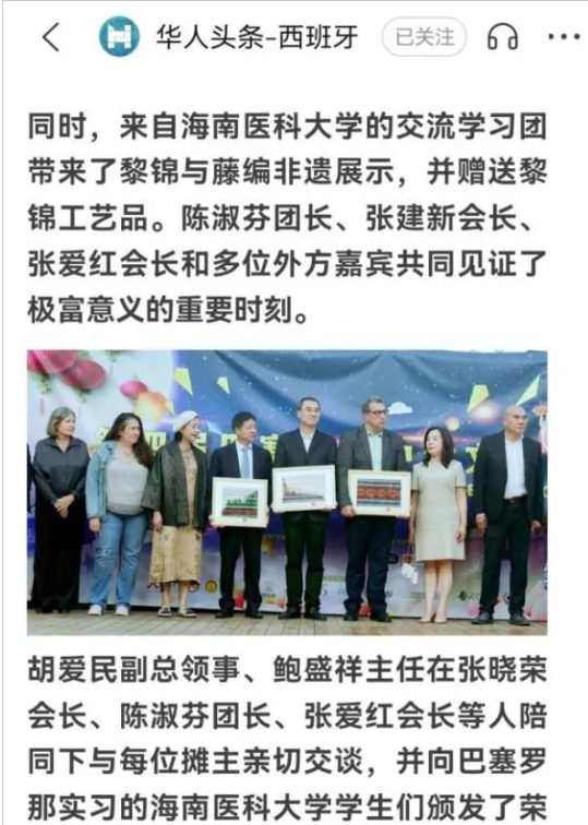 研学团还积极参加了由中国驻巴塞罗那总领馆与巴塞罗那市政府共同支持的“第四届巴塞罗那中秋文化节”。开幕式上,同学们代表学校向中国驻巴塞罗那总领馆副总领事胡爱民、巴塞罗那市政府文化事务专员佩德罗·阿吉列拉先生及主办方赠送了亲手织造的海南黎锦。这份蕴含海南民族智慧与深情厚谊的礼物,赢得了各方的高度赞誉。