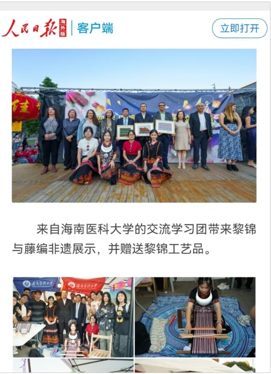 在非遗展示环节,海南黎锦与藤编技艺成为文化节的焦点。同学们以专业的仪态,向国际友人细致讲解非遗的历史与技艺,生动展现中华优秀传统文化的魅力,以实际行动搭建起中西文化交流的桥梁。