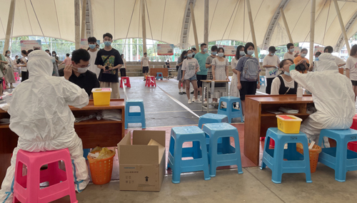 在核酸检测现场,各学院书记、辅导员以及学生工作处干部,全程参与,与海南医学院第一附属医院,第二附属医院以及附属海南医院三家医院医护人员通力配合,学工人员负责现场引导,医护人员认真采集咽拭子标本,广大学生自觉遵守纪律、有序入场检测后快速离场。在师生、医护人员的共同努力下,核酸检测工作于晚上7时结束。