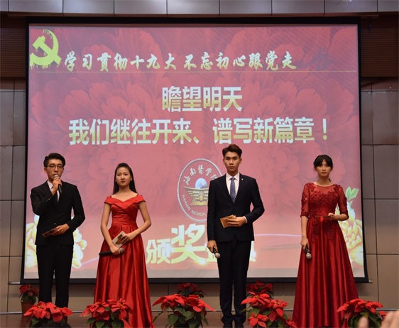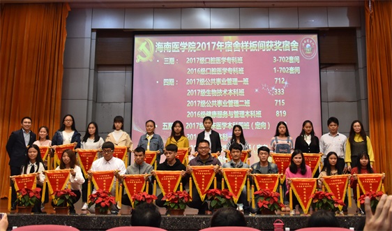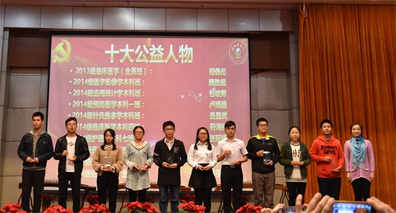 在表彰环节,大会首先表彰了获得国家级奖项的先进个人——2015级急诊医学硕士研究生陈云强同学和2014级护理学本科班戈旭伟同学。陈云强同学在2017年“外研社杯”全国英语演讲大赛中凭借自己的实力,最终夺得了全国一等奖的好成绩;戈旭伟同学获得第十五届挑战杯全国大学生课外学术作品竞赛二等奖。大会还对获得国家奖学金的同学及获得十佳学生、十大创新人物、十大科研人物、十大公益人物、十大感动人物、2017年最勤奋读者、2017年优秀信息员、无偿献血先进个人、2017年最美楼管等荣誉称号的个人,对获得十佳班级、2017年宿舍卫生先进学院、2017年宿舍卫生先进班级、2017年样板间宿舍代表等荣誉称号的先进集体给予了表彰。近80名先进个人,30余个先进集体在会上受到表彰,并依次上台领奖,林英姿副校长等嘉宾为获奖个人或集体颁发了荣誉证书或奖杯。