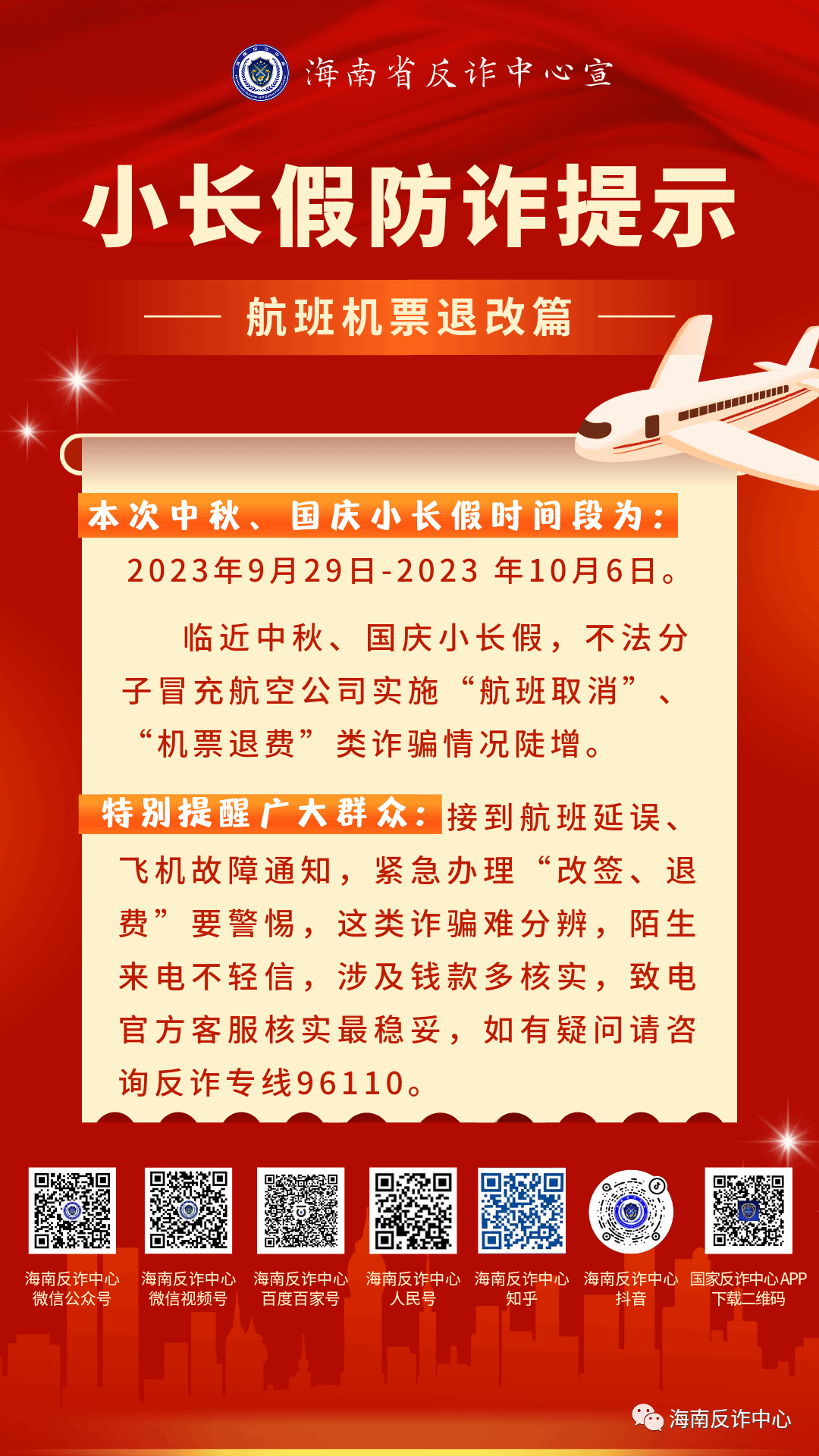 临近中秋、国庆小长假,不法分子冒充航空公司实施“航班取消”“机票退费”类诈骗情况陡增。特别提醒广大群众:接到航班延误、飞机故障通知,紧急办理“改签、退费”要警惕,这类诈骗难分辨,陌生来电不轻信,涉及钱款多核实,致电官方客服核实最稳妥,如有疑问,请咨询反诈专线96110。