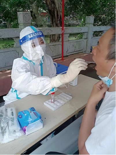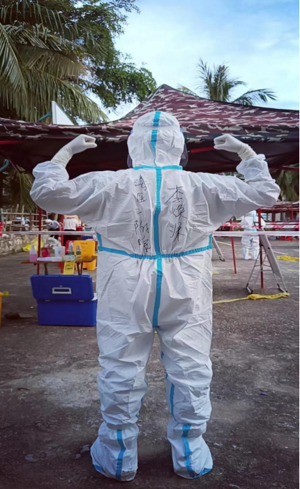 2020级护理学专业硕士刘雅萌同学介绍:“疫情发生后,外出采集核酸人员非常紧缺,而我身为一名海南医学院的医学研究生,有义不容辞的责任!于是,我跟随老师们的脚步,积极报名参加了外出采集核酸的任务。当我穿上防护服,化身成为大白,走向核酸采集点位的时候,从身边的老人、孩子还有其他群众的目光中看到了温暖与信任。那一刻,我的脚步也更加坚定,而此刻,我不是一个人在战斗,我身边还有很多的老师和同学也同我一样毫不犹豫的奔赴这场抗疫行动中,我们一起披星戴月,并肩战斗!我相信:在这个特殊时期,相信是一种力量!只要疫情还未结束,我们就会一直坚守岗位,相信我们一定可以驱散疫情的阴霾,看见满满灿烂的星光!”