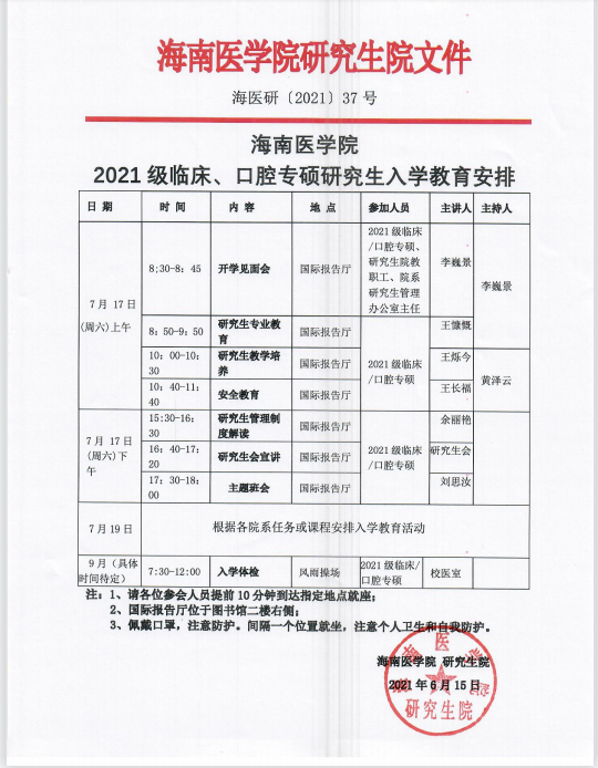 海南医学院2021级临床、口腔专硕研究生入学教育安排