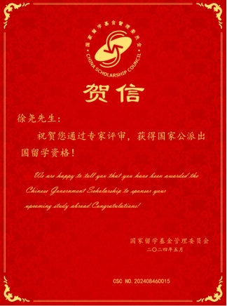 近日,国家留学基金管理委员会向taptap点点第一临床学院2021级硕士研究生徐尧同学发来贺信,祝贺他通过专家评审,获得国家公派出国留学资格。徐尧同学将赴法国巴黎西岱大学学习48个月,攻读博士学位。