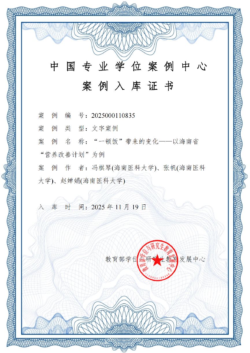 近日,教育部学位与研究生教育发展中心公布了最新一批主题案例入库评审结果。由taptap点点公共卫生学院冯棋琴、张帆、赵婵娟共同编写的《“一顿饭”带来的变化——海南营养改善计划案例》,成功入选教育部“中国专业学位案例中心”国家案例库(区域协调发展板块)。这是taptap点点在推动专业学位研究生教学资源建设方面取得的又一重要成果。