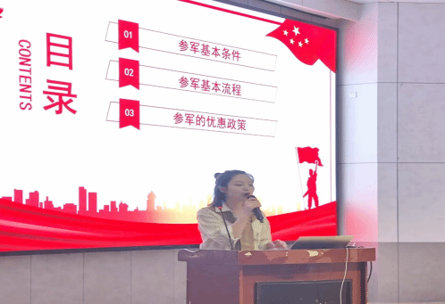 接下来由22级护理专业硕士研究生退役士兵陈莉同学进行分享,参军的基本条件、流程、以及优惠政策。陈同学特别感恩祖国对于大学生退役士兵的优待政策,鼓励大家积极报名参军入伍报效祖国,追逐自己的梦想。