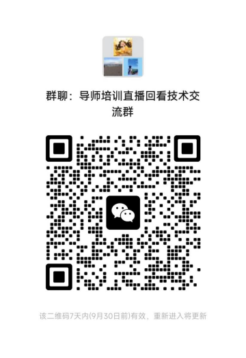 2.为及时解决各位导师在参加线上培训时出现的各种技术问题,请参加此次线上培训的导师及相关人员自行扫码加入“导师培训直播回看技术交流群”,群内有线上培训平台技术人员为大家答疑。
