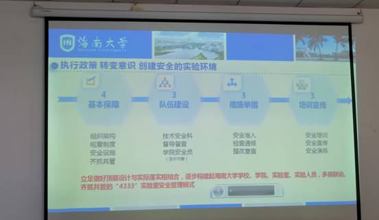 在这里,海南大学实验室与设备管理处副处长刘艳凤给我们介绍了海南大学实验室安全建设的管理模式及化学危险品、气瓶安全管理方面的知识。据介绍, “海大”实验室安全建设经费2020年投入400万元,2021年又投入1300万元,可见学校对实验室安全基础建设的重视。海南大学实验室安全建设的理念是“立足做好顶层设计与实际落实相结合,逐步构建起海南大学学校、学院、实验室、实验人员,多级联动、齐抓共管的‘4333’实验室安全管理模式”。