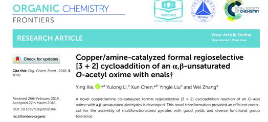 2018年5月27日,我院有机及物化教研室陈训课题组在《Org. Chem. Front》在线发表题为“Copper/amine-catalyzed formal regioselective [3+2] cycloaddition of an α,β-unsaturated O-acetyl oxime with enals ”的文章。多取代吡咯骨架结构是天然产物、药物分子和材料分子的基本组成结构,在生物、医药和材料科学等领域具有潜在的应用价值。为此,该课题组利用铜/胺协同催化肟酯与二烯醛的高选择性[3+2]环化反应高效简便地制备了多取代吡咯化合物。同时该课题组还围绕功能性吡咯骨架的构建,相继在ACS Catal. 2018, 8, 1308;Chin. J. Org. Chem. 2018, 38, 1859(封面文章)等期刊上发表了相应的研究工作。