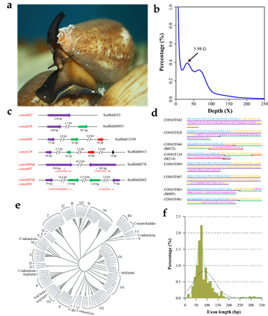 尽管有许多芋螺物种具有公开的转录组和蛋白质组数据,但是还没有报道基因组组装。本文以中国桶形芋螺(C.betulinus)为代表,对第一个桶形芋螺基因组进行了测序和组装,初步鉴定了133个芋螺毒素基因。在整合了同一物种的基因组学、转录组学和多肽组学数据后,我们建立了多种功能性芋螺多肽毒素的遗传中心法则,假设总基因/转录物/前体/翻译后修饰肽的数量比为~1:1:1:10s。可变肽处理以及种内变异可以解释133个基因和~131个转录本如何在单个桶形芋螺的毒液中产生数千个多肽。我们还预测了许多与假定的镇痛药ω-MVIIA、成瘾治疗AuIB和杀虫肽ImI具有高度立体结构相似性的芋螺毒素,表明我们目前的高质量基因组组装是高通量预测和潜在药物开发的宝贵遗传资源。