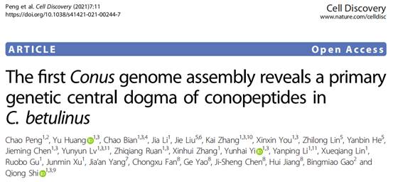 2021年2月23日,我院海洋药学教研室高炳淼教授与深圳市华大海洋研究石琼院长合作在《Cell discovery》在线发表题为“The first Conus genome assembly reveals a primary genetic central dogma of conopeptides in C. betulinus”的论文。芋螺毒素(conotoxins,conopeptides)能够作用于不同离子通道及神经受体,具有高专一性的小分子多肽化合物,主要应用于慢性疼痛、癫痫和癌症等,如MVIIA已被FDA批准作为晚期癌症镇痛药。