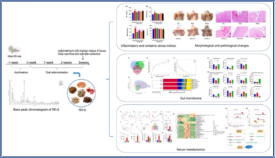 在使用吲哚美辛(30mg/kg,单次口服剂量)诱导胃溃疡之前,大鼠口服RD-6(0.27、1.35和2.7g/kg)或雷尼替丁(40mg/kg)三周。我们定量测定胃溃疡指数、溃疡面积、H&E染色以及TNF-α、iNOS、髓过氧物酶(MPO)和丙二醛(MDA)水平,以评估RD-6的溃疡抑制作用,并将16S rRNA基因测序与LC-MS代谢谱相结合,研究RD-6对大鼠肠道微生物群和血清代谢产物的影响。此外,Spearman分析用于计算差异微生物群和代谢物之间的相关系数。RD-6可抑制吲哚美辛对大鼠的胃损伤,使溃疡指数下降50.29%(p<0.05),降低胃组织中TNF-α、iNOS、MDA和MPO的水平。此外,RD-6重塑了多样性和微生物组成,并逆转了减少的细菌,包括[真细菌]_xylanophilum group、Sellimonas、脱硫弧菌和UCG-009,以及吲哚美辛诱导增加的水微菌属。此外,RD-6调节包括氨基酸和有机酸在内的代谢产物的水平,这些受影响的代谢产物参与牛磺酸和亚牛磺酸的代谢以及色氨酸的代谢。Spearman分析显示,肠道微生物群紊乱与血清差异代谢物的变化密切相关。结合16S rRNA基因测序和LC-MS代谢结果,本研究提出了RD-6通过调节肠道菌群及其代谢产物改善GU的机制。