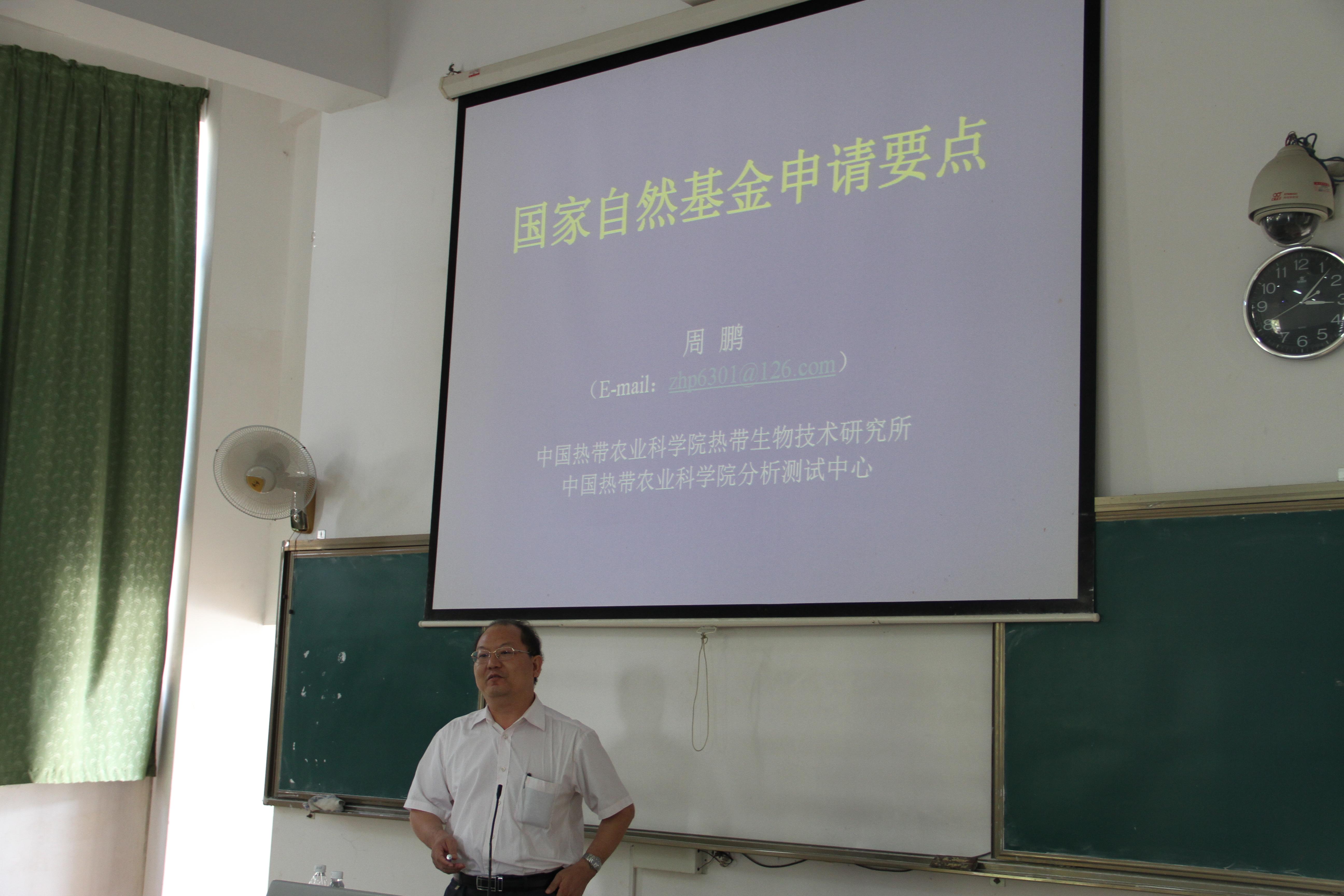 2013年11月8日下午3:00,应药学院张俊清院长的邀请,中国热带农业科学院分析测试中心书记,博士生导师周鹏教授在1-201多媒体教室作了题为“国家自然科学基金申请指导”的讲座。本场讲座由药学院张俊清院长主持,药学院教师及科研人员认真听取了讲座。其他院系的多名教师也自发来到讲座现场,认真听取了讲座。