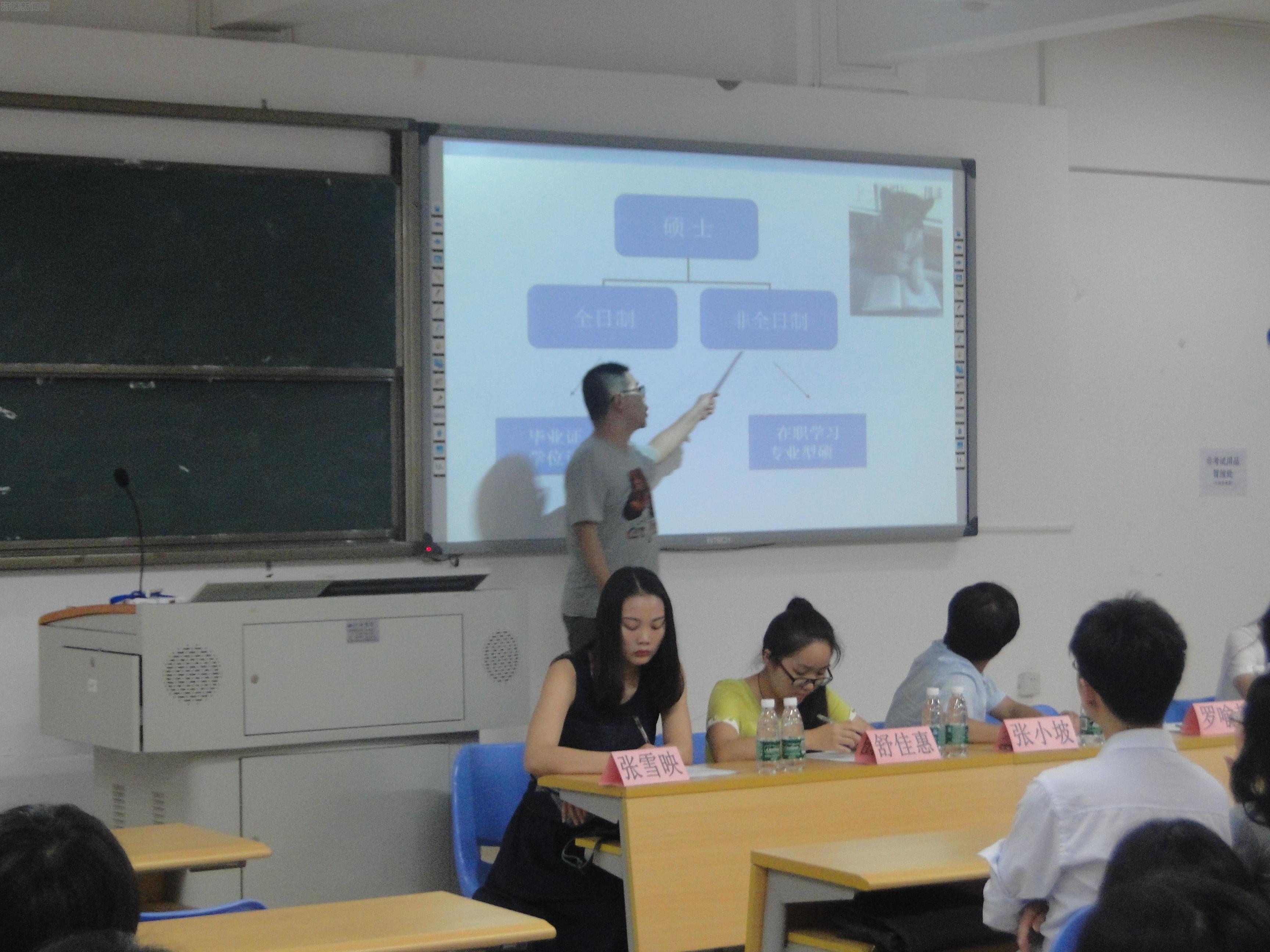 讲座伊始,主持人对到场的嘉宾分别作了介绍并欢迎各位在场观众的到来。首先,由罗喻超老师对考研相关知识进行解读。他分别就研究生类别及研究方向、考研流程、考研科目以及注意事项等几个方面的知识作简要的讲解,并针对学生对考研的理解提出了三个误区和七点建议。接着,张小坡老师给大家播放了关于研究生生涯的幻灯片,他表示研究生学习的过程中存在着艰辛和收获,生活也或多或少地发生了些变化,并告诉我们:“不是每一位学生都适合考研这条路,考研更不是唯一的出路。”紧接着,在场的三位已考研的学姐给大家分享了自己的考研经历与学习心得。最后一个环节是自由提问环节。在场的学生纷纷提出自己的疑问,提问的学生除了有正在准备考研的大三学生,还有不少大一学生。面对学生提出的问题,五位嘉宾都回答得很详细,并提出了各自的看法。