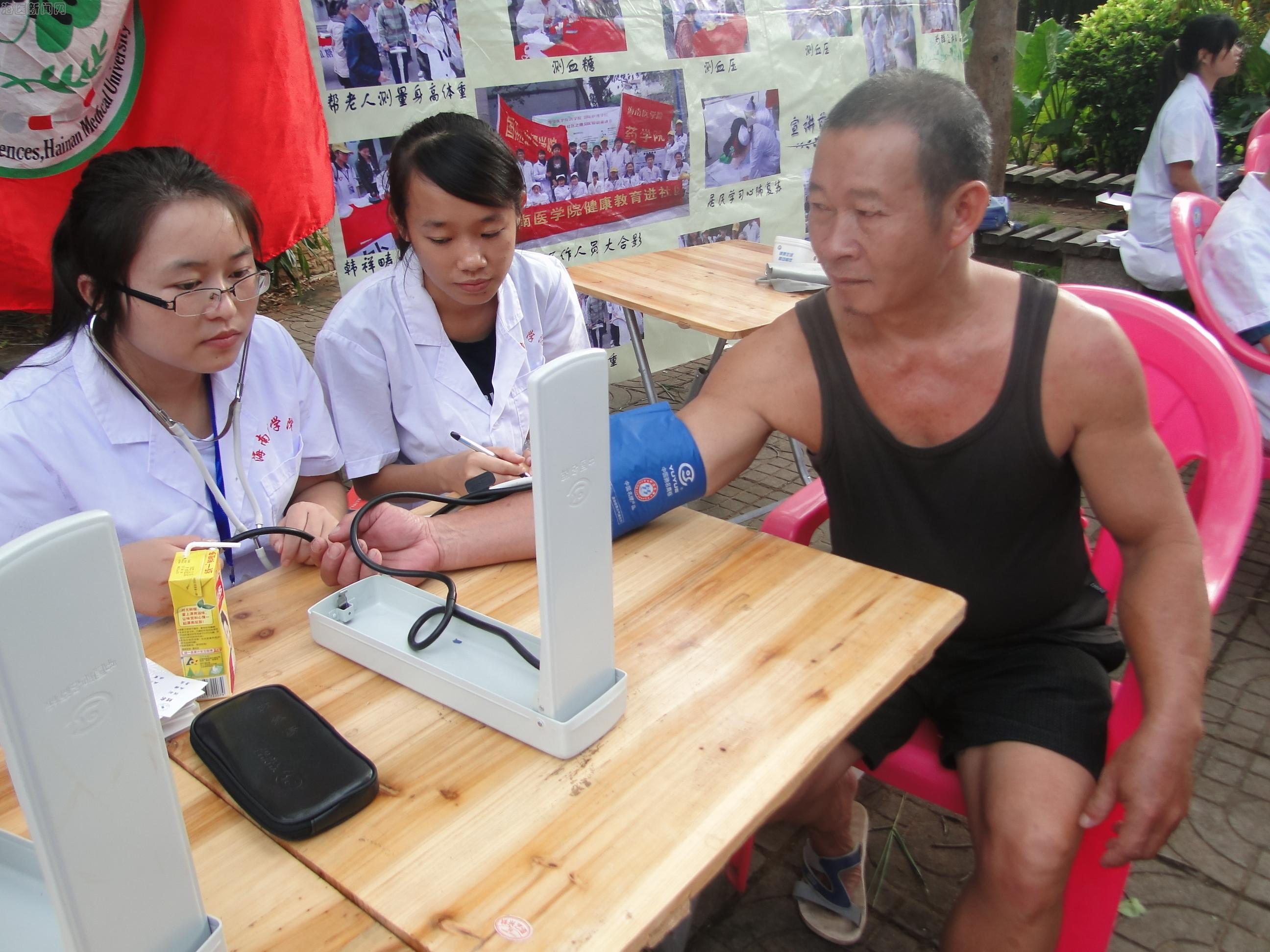 清晨5点,天刚亮,药学院的志愿者们已经到达海口市君尧小区的门口摆开了宣讲台,整理好需要用的仪器及试纸。不久,人们就陆陆续续的来了,志愿者对前来咨询的人进行个人信息登记,并依次进行免费身高、体重、血压、血糖测量。大家也都积极配合志愿者做好记录,志愿者针对高血压人群提出合理运动、合理膳食、不吸烟、控制饮酒、定期测量体重血压等建议。除此之外,志愿者们在现场指导群众学习心肺复苏操作要领和基本的急救包扎方法,民众们也目不转睛的看着操作演示,现场也还排起了队练习操作,志愿者也一个一个耐心的指点操作要领。
