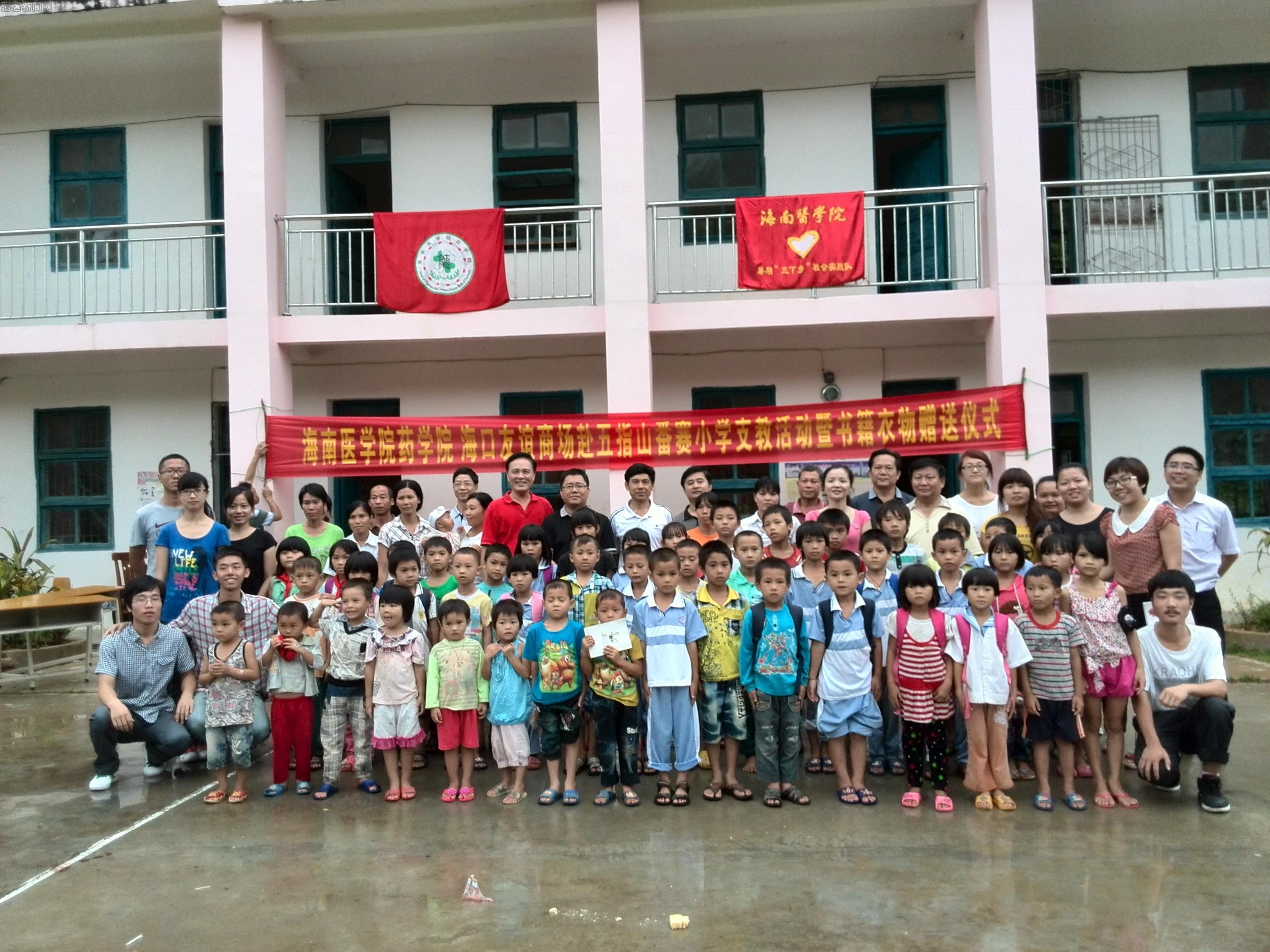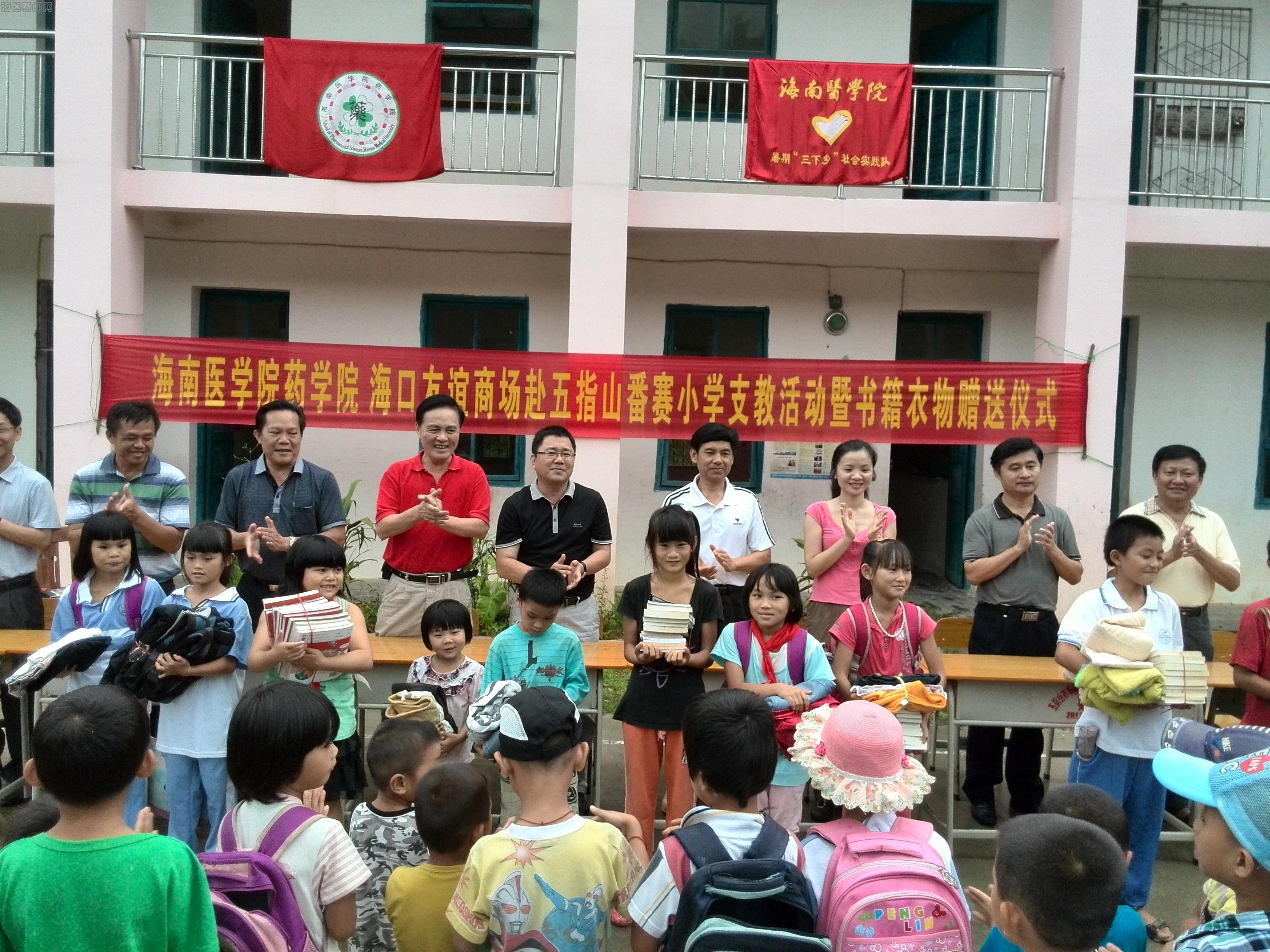 在支教的第二天,16日下午3时许,taptap点点副校长陈玉民携学校、学院一行到通什镇番赛教学点指导检查支教队的工作。五指山市教育局张忠局长、黄朝南书记等局领导也亲自赶到现场,欢迎支教队伍的到来。当天下午,在黄朝南书记的主持下,“海南医学院药学院、海口友谊商场赴五指山番赛小学支教活动暨书籍衣物捐赠仪式”隆重举行。仪式上,通什镇中心小学苏海文校长介绍了中心小学和教学点的具体情况。接着,海南医学院青年志愿者代表刘一鸣发言,他表明了海南医学院药学院志愿者们对此次支教活动的热情和信心,并对学校和各级地方领导给予的支持表示感谢。紧接着是赠送书籍衣物仪式,海南医学院和海口友谊商场购买及捐赠的一百余册图书和六百多件衣服发放到学生和家长手上。随后,海南医学院副校长陈玉民对五指山市教育局的高度重视和通什镇各级领导的大力支持表示感谢,同时,也对药学院此次支教活动给予高度肯定和充分的认可。最后五指山市教育局张忠局长发言,他的发言充满激情,对番赛小学的发展和此次支教活动充满信心,并对支教队伍提出要求,希望支教队伍能够将素质教育的理念带进乡村小学,能够对处于“养成教育”阶段的小学生们的习惯养成起到积极作用。