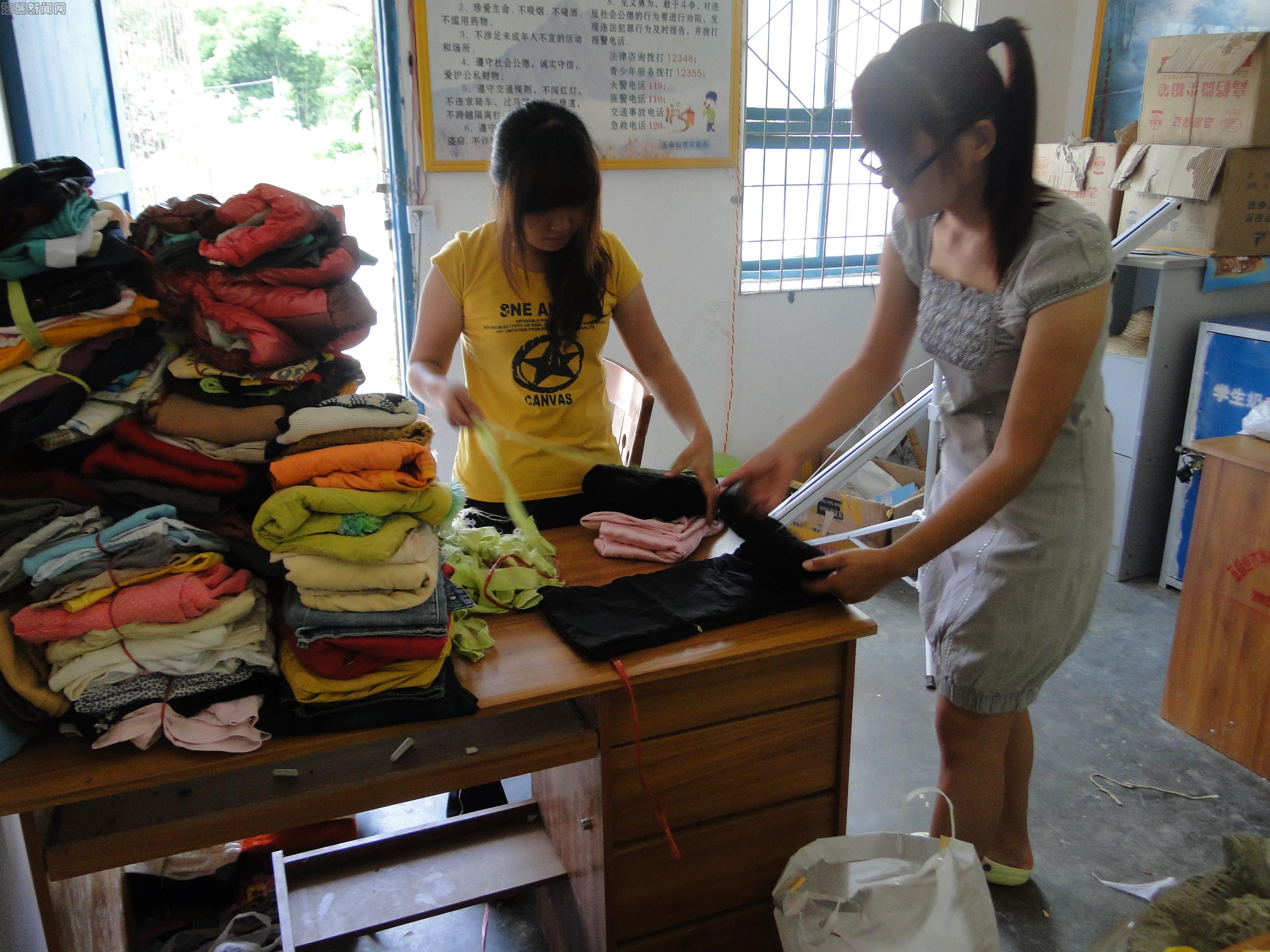 志愿者整理好心人捐赠的衣物
