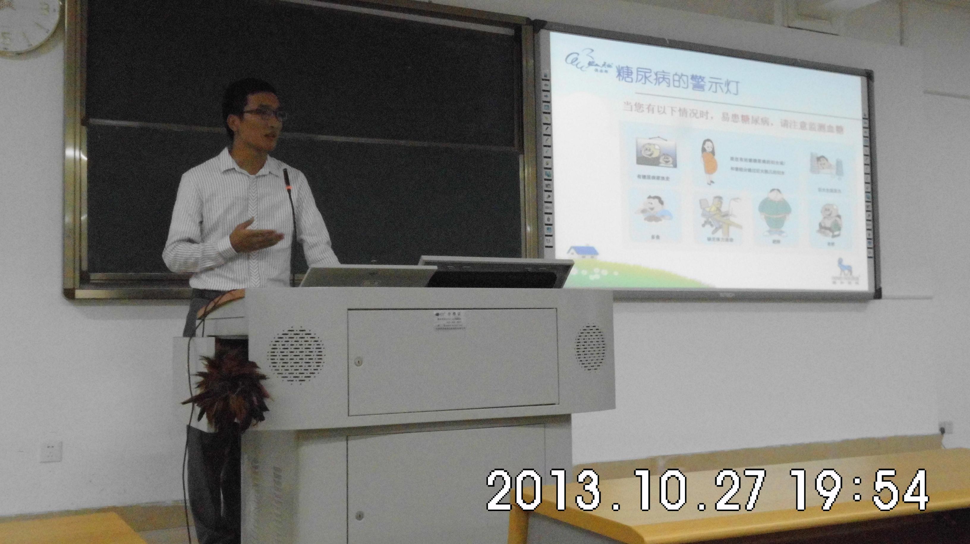 为了使志愿者们加深对糖尿病相关知识的认知,提高其对糖尿病知识的宣讲能力,药学院于10月27日晚在4教306教室举办糖尿病知识讲座。此次讲座邀请到世界领先的生物制药公司诺和诺德学术推广张健进行主讲,药学院团委副书记李咪参加并主持了讲座。参加此次讲座的还有药学院的部分学生干部和药学院全体13级学生。
