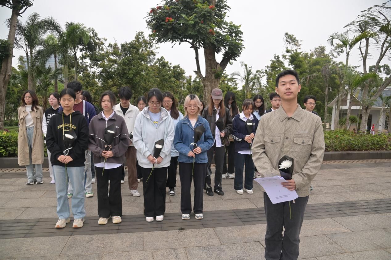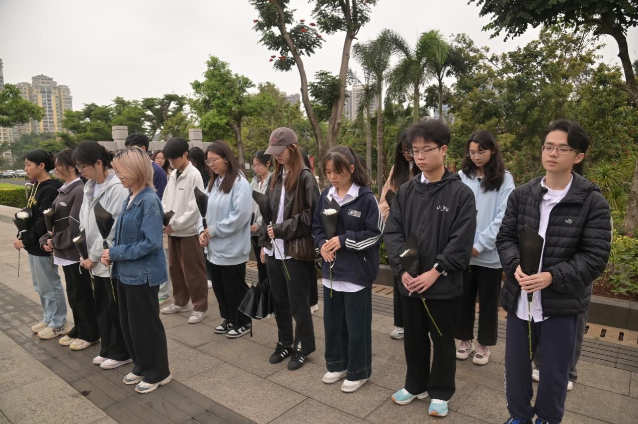 致辞完毕,全体同学缓缓低下头,进入了默哀环节。一时间,整个陵园安静得只能听到微风拂过树叶的沙沙声,同学们都在心底默默缅怀那些为了今天的幸福生活而奉献出生命的英雄们。