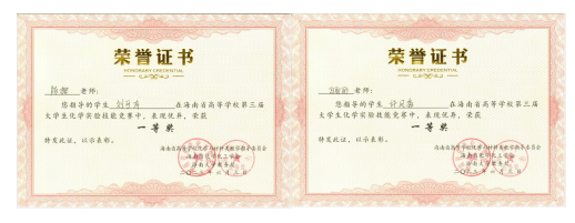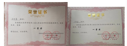 为了推动我院人才培养模式和实验教学改革,促进化学实验教学内容和教学方法的创新,提高我院学生化学实验技能的水平,强化药学专业本科生实践能力和科学素养,提高学生们积极参与科学探索和研究的兴趣。药学院由孔杜林书记、高炳淼副院长、陈榕教授和邱军强老师带队,于 2023 年 6 月 3 日参加由海南大学理学院主办,海南省化学化工学会和海南师范大学化学与化工学院承办的“海南省高等学校第三届大学生化学实验技能竞赛”。我院21药本一班许凤香和21药本三班刘可成荣获一等奖,20临床药学张传震、张瑜,20海洋药学朱博峰,21药本一班林久盛,21药本二班赵怡、尹琪,21中药张笑鸣和邓卓娴荣获三等奖。