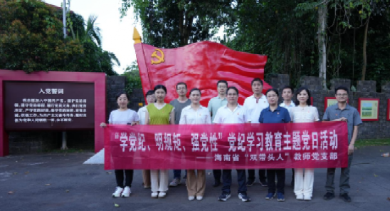 2024年是中国共产党成立103周年,也是中华人民共和国成立75周年。为进一步推动党纪学习教育活动走深走实,全面营造学纪、知纪、明纪、守纪的浓厚氛围,7月7日下午,海南省“双带头人”教师党支部全体党员到仁台红色革命教育实践基地开展“学党纪、明规矩、强党性”党纪学习教育主题党日活动。药学院院长王艳丽以普通党员身份参加主题党日活动,党支部书记高炳淼,党支部副书记董琳、支委会李晓亮、张旭光等全体党员参加本次主题党日活动。