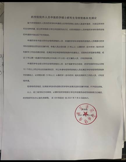药学院院外人员申报药学院硕士研究生导师资格补充规定