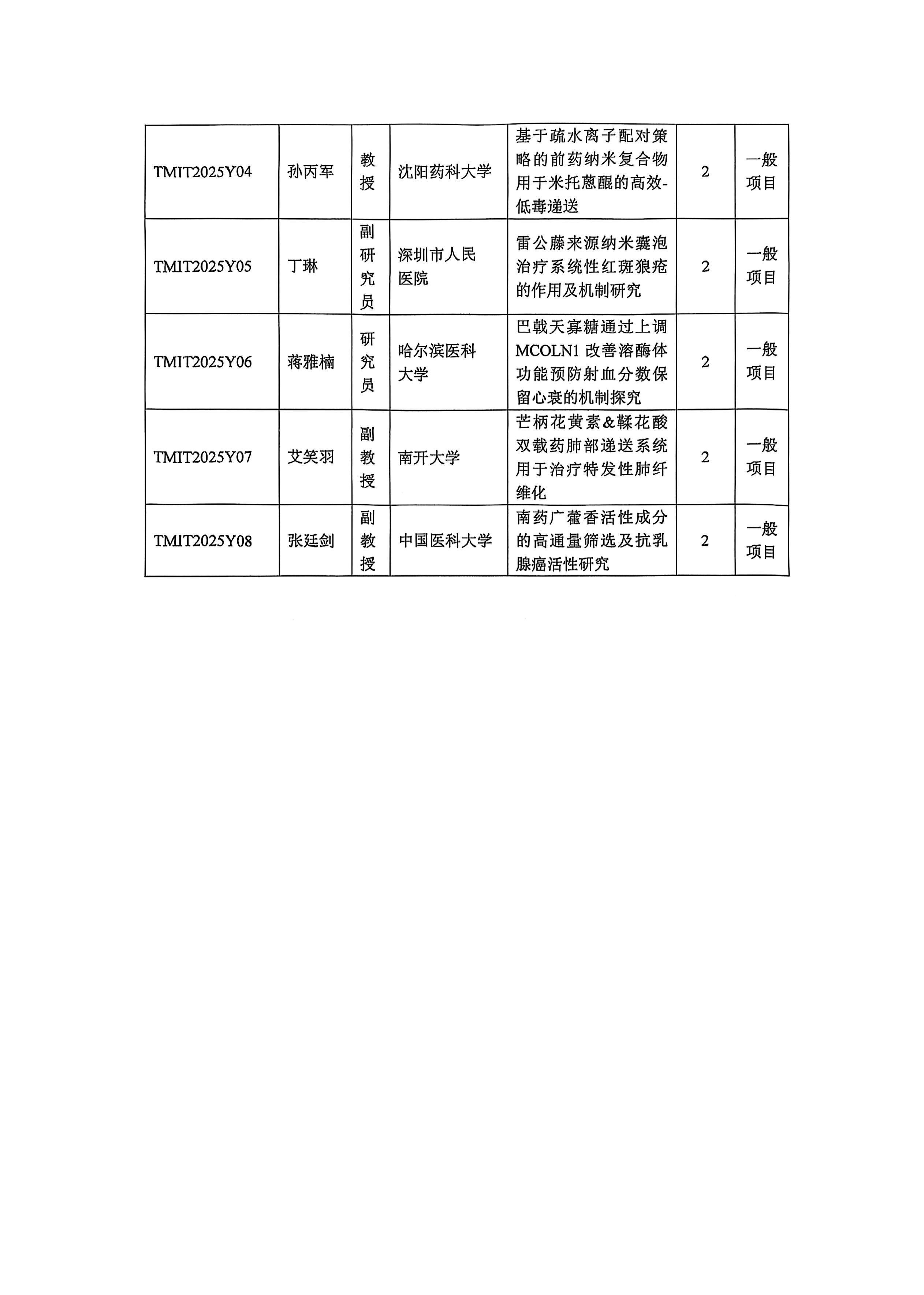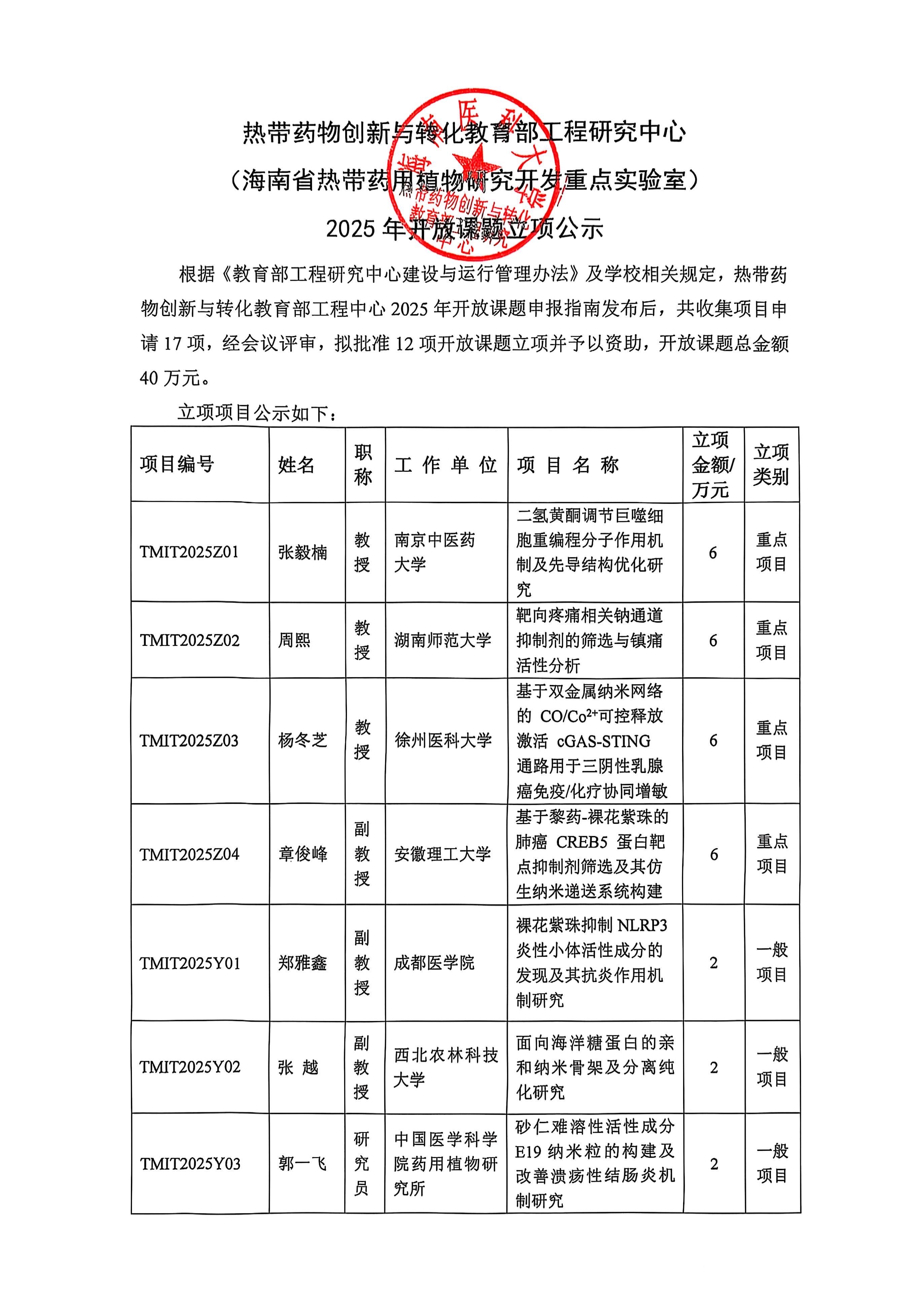 热带药物创新与转化教育部工程研究中心(海南省热带药用植物研究开发重点实验室)2025年开放课题立项公示