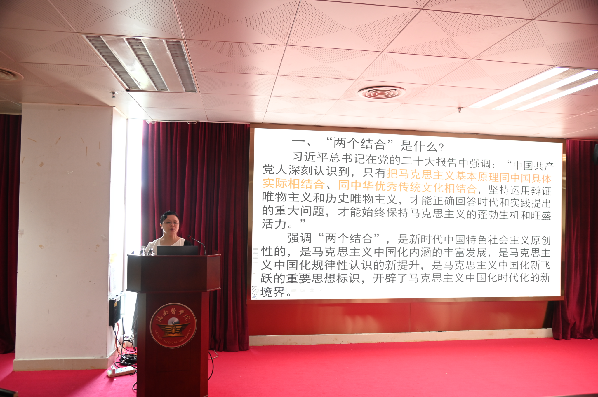 上午会议伊始,首先由马克思主义学院邓少柳老师讲授题目为《从“一个结合”到“两个结合”——不断开辟马克思主义中国化时代化新境界》的党课。邓老师在宣讲中,紧紧围绕两个“结合”是什么;我们党为什么要“两个结合”;我们怎样才能做到更好的“两个结合”;这三个方面进行了阐述,我们必须把握好习近平新时代中国特色社会主义思想的世界观和方法论。