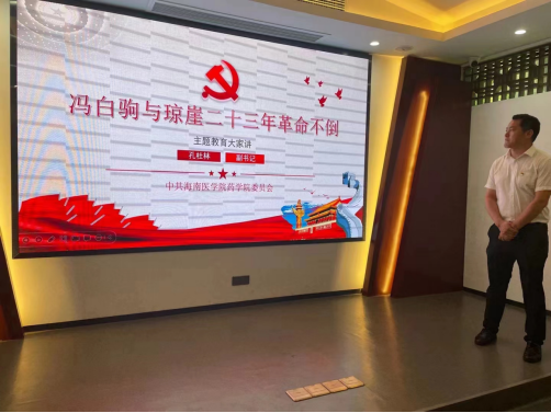 参观结束后,全体师生前往观影室,认真聆听由孔杜林副书记讲解的微党课,他通过冯白驹将军的革命历史故事,向大家展示了革命先辈艰苦奋斗的作风、敢于斗争的精神,他提出,英烈需要学习,精神需要传承,我们新时代的革命军人更要提高自己的思想觉悟,扑下身子、实干担当,永葆初心本色,把先烈的革命精神传承下去,扎扎实实做好各项工作。大家纷纷表示,这次党日活动是一堂生动的党史学习教育课和党性教育课,将以参加本次活动为契机,更加自觉传承和弘扬以冯白驹为代表的革命先辈们信念坚定、英勇无畏、艰苦奋斗、无私奉献的红色精神,传承红色基因,赓续红色血脉,不断加强党性锤炼,以更坚定的政治自觉、更昂扬的精神状态、更务实的工作作风和更过硬的能力本领,踔厉奋发,砥砺前行,以实际行动推动学校更名医科大学,更好服务保障中国式现代化和为海南自贸港建设作出新的更大贡献。