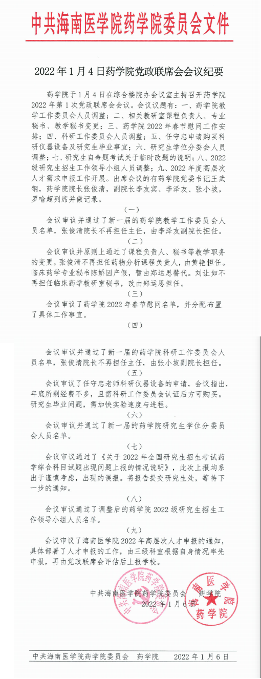 2022年1月4日药学院党政联席会会议纪要