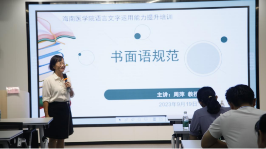 为进一步提高taptap点点干部公文写作能力,掌握公文写作格式规范及书面语规范。2023年9月19日下午,海南医学院语言文字工作委员会办公室在笃行楼七楼学术报告厅组织开展语言文字工作能力提升培训专题讲座。此次讲座邀请海南省语言文字工作专家组核心成员、琼台师范学院周萍教授授课。各二级单位语言文字联络员、党政办公室主任、教学办主任、二级学院团委、学工办负责人以及学生助理等近120人参加讲座。