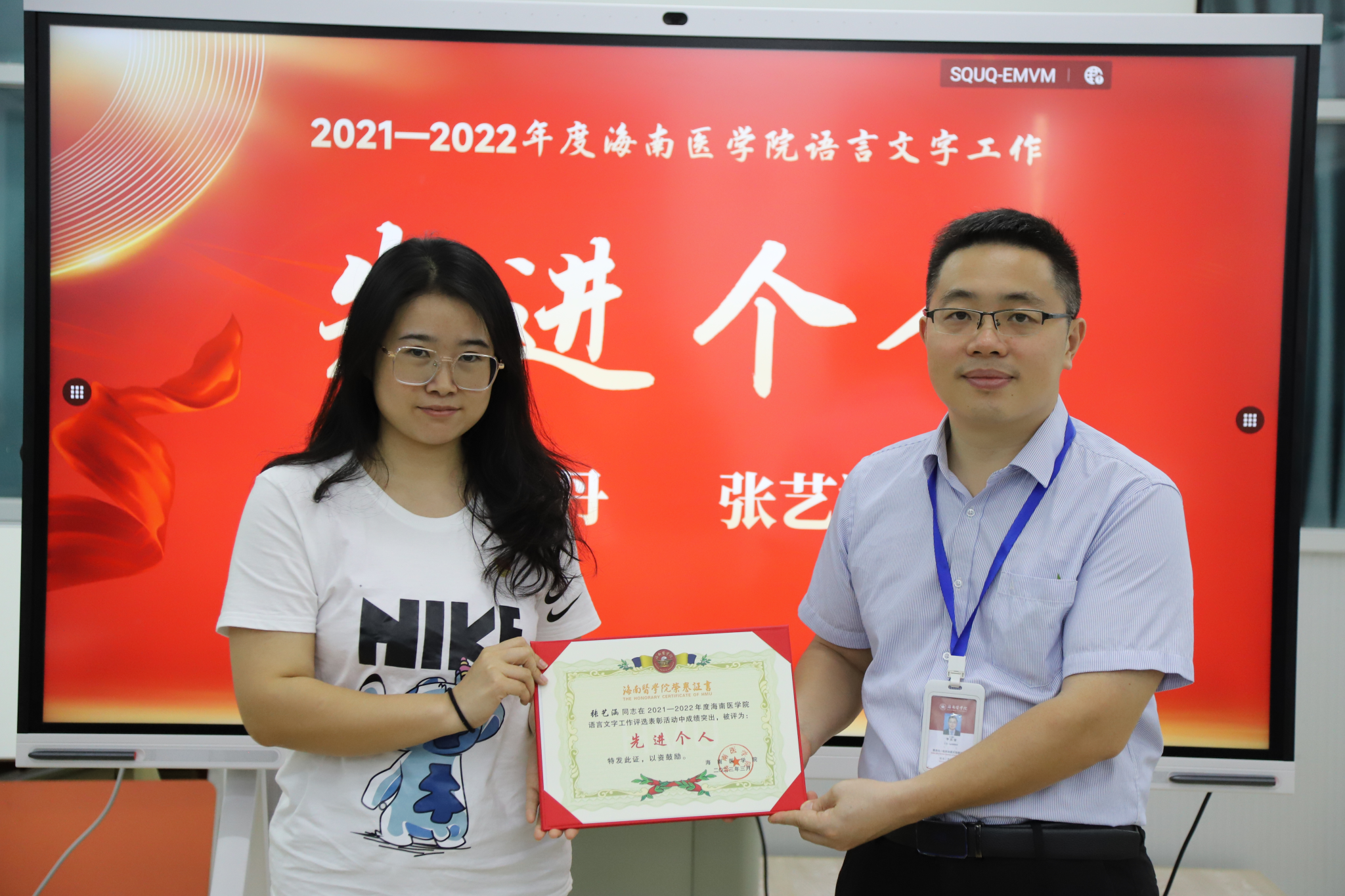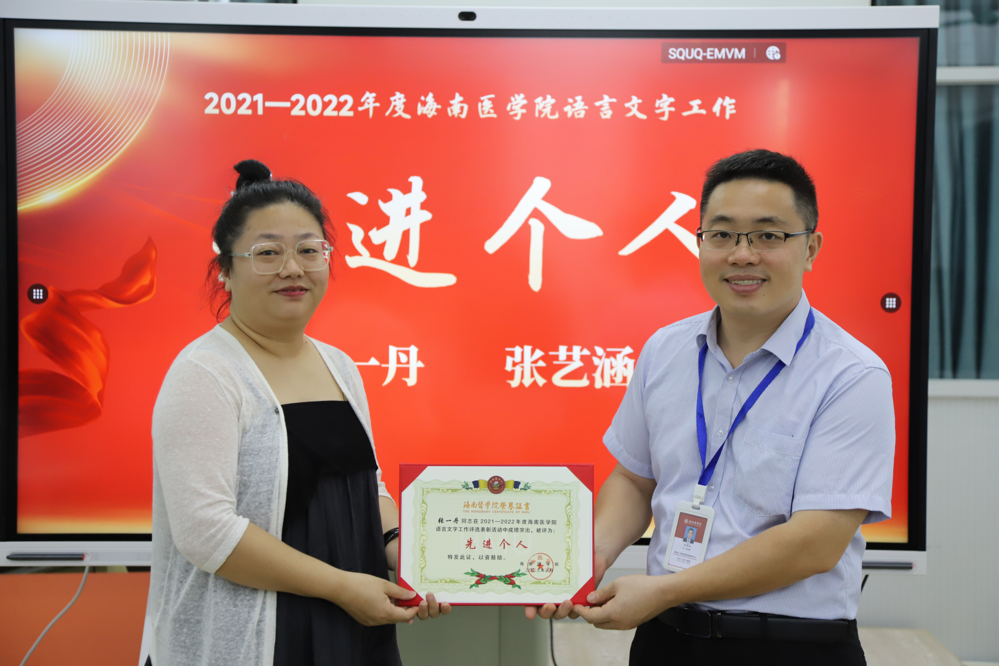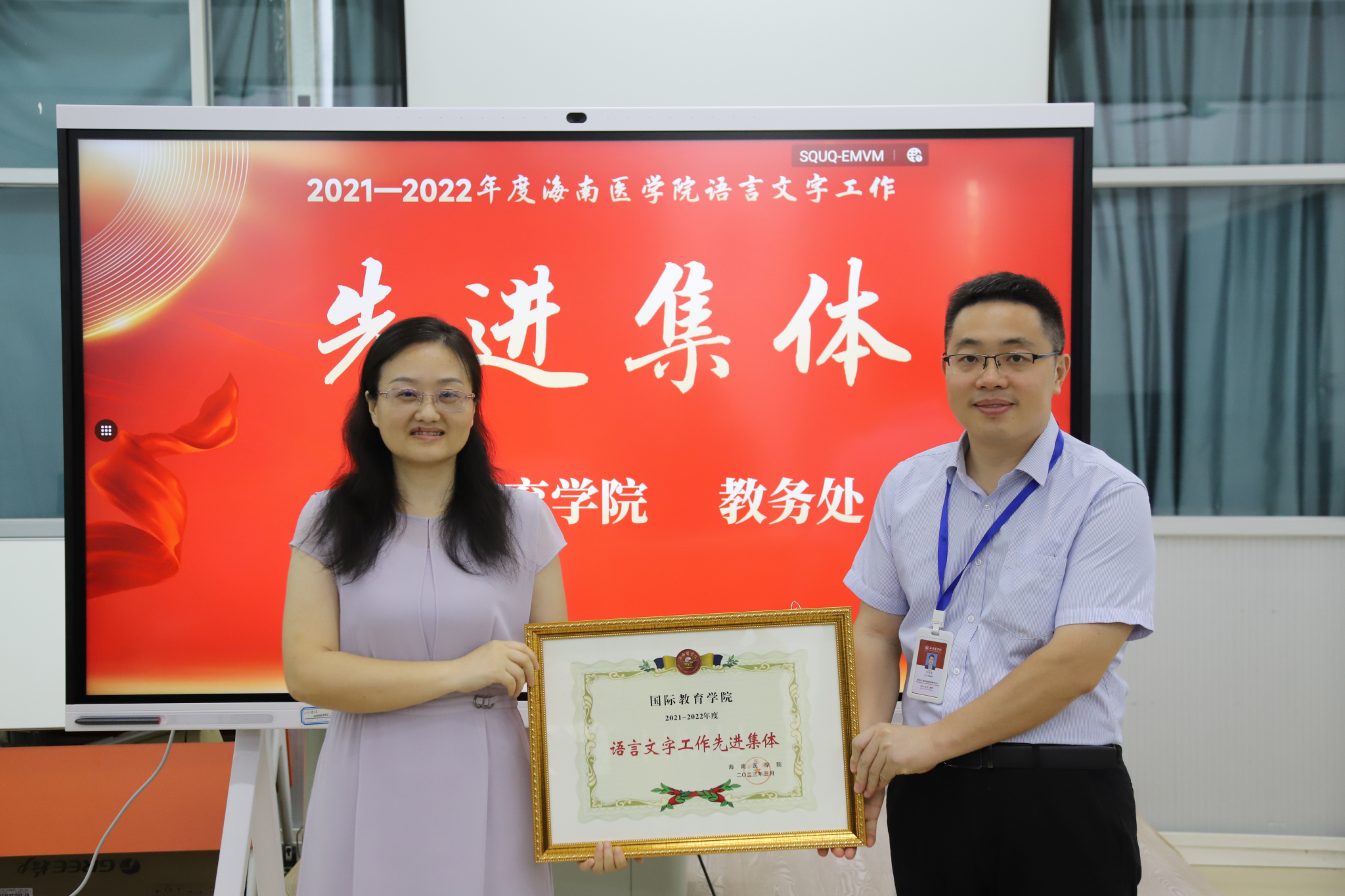 海南医学院首届语言文字工作先进评选表彰活动于4月26日在综合楼连106教务处会议室举行,taptap点点教务处处长、语言文字工作委员会办公室主任李其富、教务处副处长牛莉娜为获奖单位及个人进行现场颁奖。