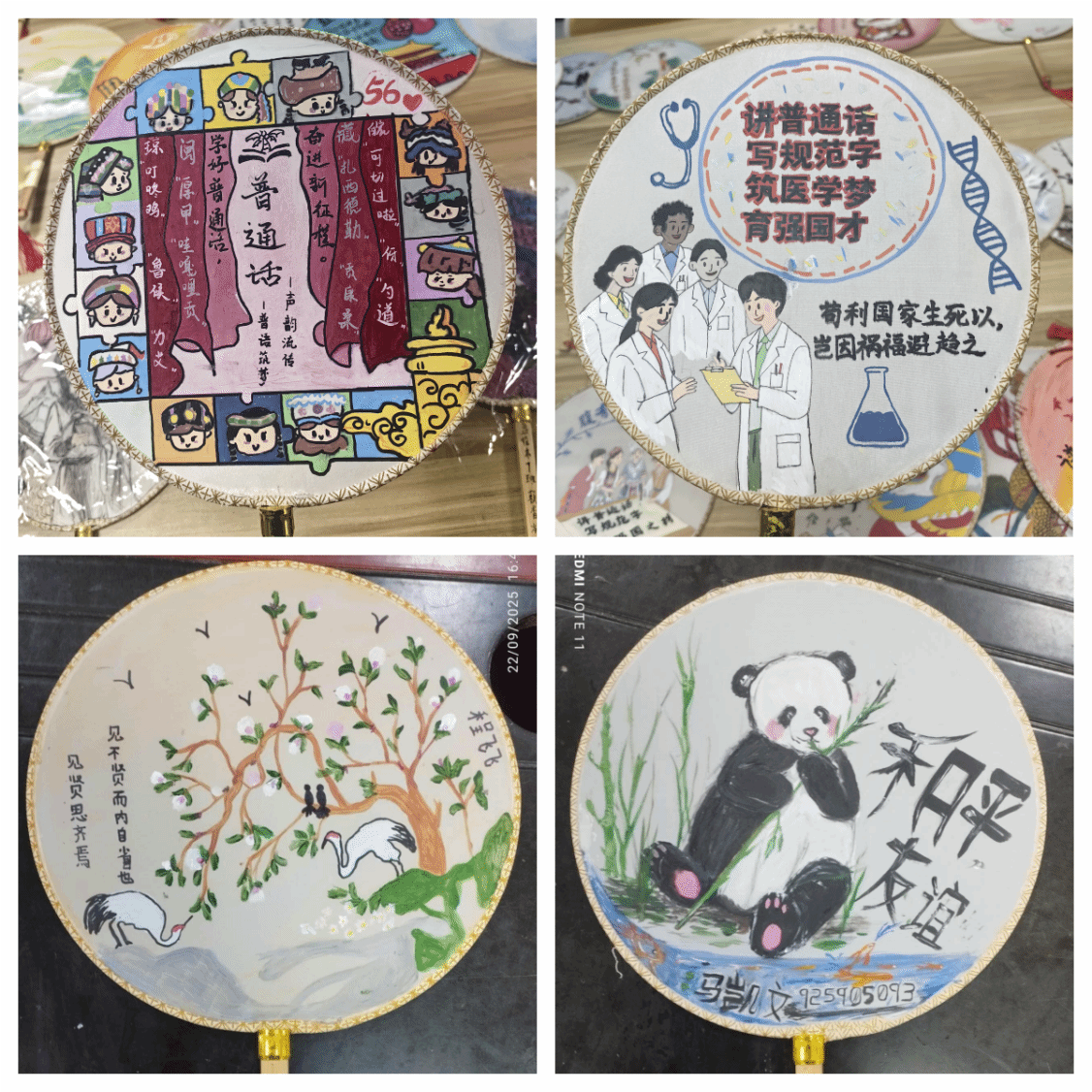 中国学生组作品聚焦于“语言文字规范表达”,让推普标语在笔墨间焕发多样光彩。基础医学院刘柯含同学在扇面上书写标语“讲普通话,写规范字,筑医学梦,育强国才”,并绘制听诊器、DNA双螺旋链、医务人员等图案,将“语言规范”与“医学使命”紧密相连,彰显了医者担当;第二临床医学院程萌萌同学聚焦“民族共同体”主题,通过绘有不同民族的头像剪影,以及不同民族的代表性方言,发出了“学好普通话,奋进新征程”的号召。