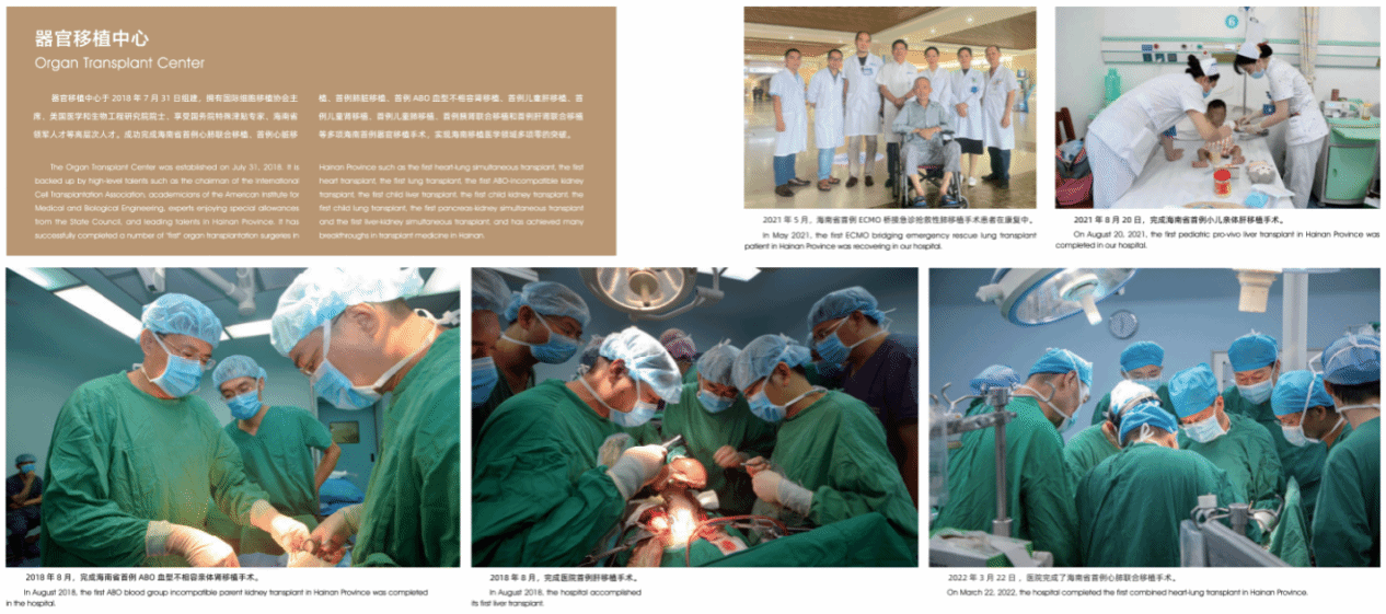 医院以“一部、两所、四院、四中心”发展战略,深入推进学科群打造,目前拥有5个国家级重点专科(心血管外科、胃肠外科、重症医学科、消化内科、心血管内科),3个国家级医学分中心(国家感染性疾病临床研究中心分中心、国家热带病研究中心海南分中心和国家心血管疾病临床医学研究中心分中心),10个省级重点学科(感染性疾病科、器官移植科、消化内科、普通外科、肝胆外科、心血管内科、心脏大血管外科、热带病科、重症医学科和麻醉科),2个省级医学中心(海南省危重孕产妇救治中心、海南省危重新生儿救治中心),3个省级临床医学研究中心(海南省急危重症临床医学研究中心、海南省热带疾病临床医学研究中心、海南省泌尿系统疾病临床医学研究中心),1个国家卫健委重点实验室(国家卫生健康委员会热带病防治重点实验室),2个研究所(移植医学研究所、肾脏病研究所),2个院士创新平台(于金明院士团队创新中心、樊代明院士团队创新中心),1个院士工作站(马骏院士工作站)。医院拥有全球领先的磁共振引导直线加速器一台、PET/MR一台、3.0T/1.5T磁共振五台、超高端256排宝石CT、320排宽体探测器CT及双源CT等共十一台CT、双板悬吊DSA及单板DSA共三台,ECMO四台、高端心脏、四维超声等大型高新尖端医疗设备,医院目前有设备7909台(套),设备总值11.45亿,100万以上设备180台(套),50万以上设备355台(套);医院医疗特色鲜明,五大实体器官移植及其联合移植、心脏大血管疾病综合救治、急危重症抢救、神经系统疾病综合治疗、肿瘤高端诊断与治疗、热带病与耐多药结核病诊断与治疗、外科快速康复治疗以及突发公共卫生事件处置能力等方面均已达到海南省内领先、国内先进水平。