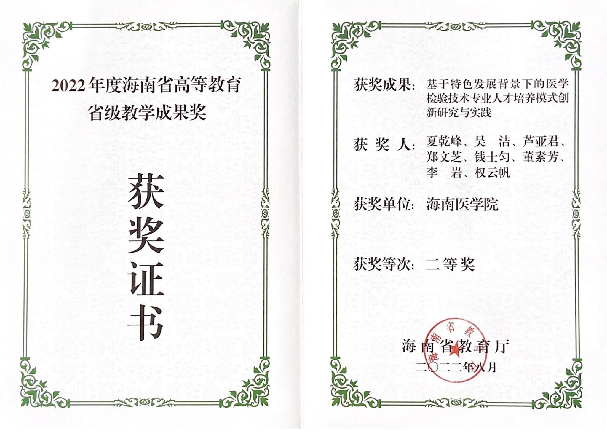 近5年来,学院积极推进专业教学改革,提高专业课程教研水平和教学质量。学院获批海南省高等教育省级教学成果奖一等奖1项、二等奖2项,海南省高校教育教学改革研究项目15项(重点项目6项)、海南省一流本科课程5项,海南省高校精品在线开放课程2项;教育部首批新工科研究与实践项目顺利通过验收;临床检验学教研室成功获评国家首届全国教材建设先进集体;实验诊断学课程入围首届全国高校教师教学创新大赛海南省赛,温莹莹教学团队获得第二届全国高校教师教学创新大赛三等奖。