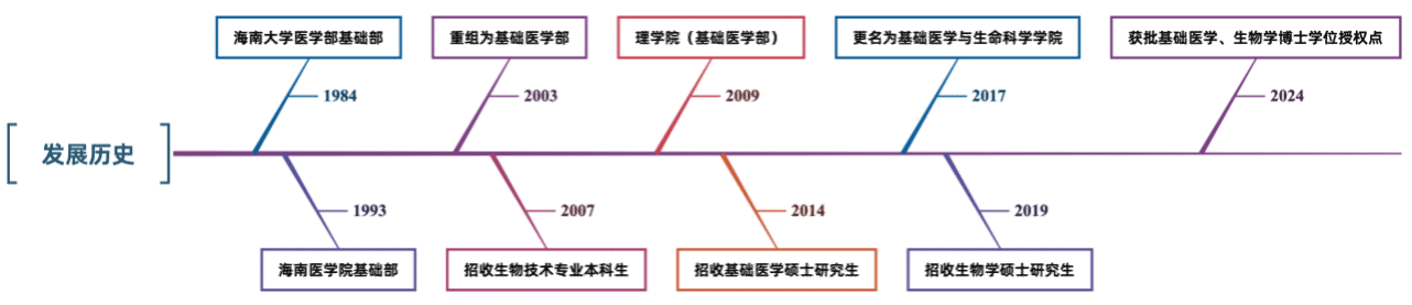 学院前身可追溯到1984年基础医学部,历经四十余年岁月,目前已进入全新发展阶段,现有第三批“全国高校黄大年式教师团队”入围团队1个,2024年学院荣获“全国教育系统先进集体”称号。学院基础医学学科为海南省特色重点学科,现有教研室11个,省级特色实验教学示范中心1个,教育部重点实验室1个,省级重点实验室2个,全国科普教育基地1个,承担人体解剖学、组织学与胚胎学、生理学、生物化学与分子生物学、细胞生物学、医学遗传学、医学免疫学、病原生物学、病理学、病理生理学、药理学、实验生理学、病原生物学与免疫学实验等课程的理论和实验教学任务。学院开设生物技术本科专业,有基础医学和生物学2个一级学科博士和硕士学位授权点。