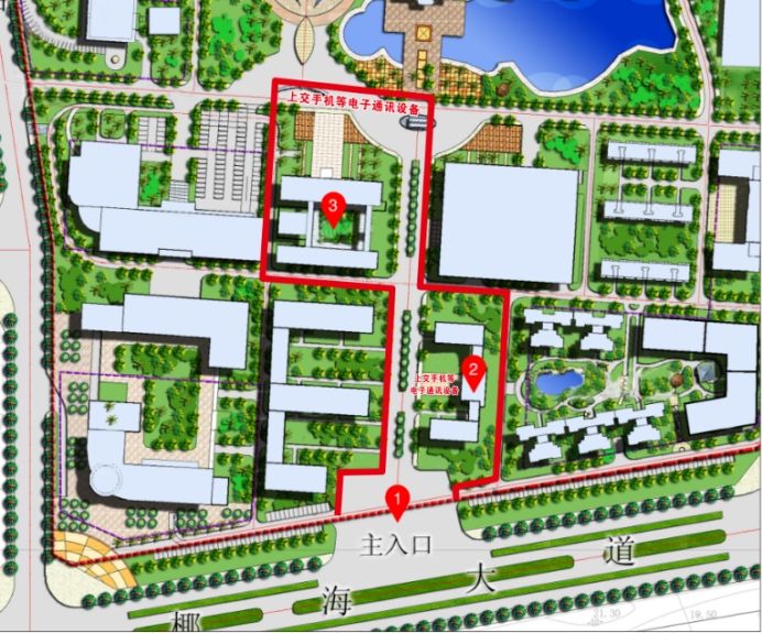 7.本次考试期间,所有非本校校内住宿考生须从椰海大道博学门(南大门)进出校园,考试期间不得进入校园非考试区域(图中红线外区域),考后不得在校内逗留,聚集。