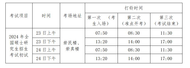 2.考试打铃安排:每场考试共有3次,具体见下表: