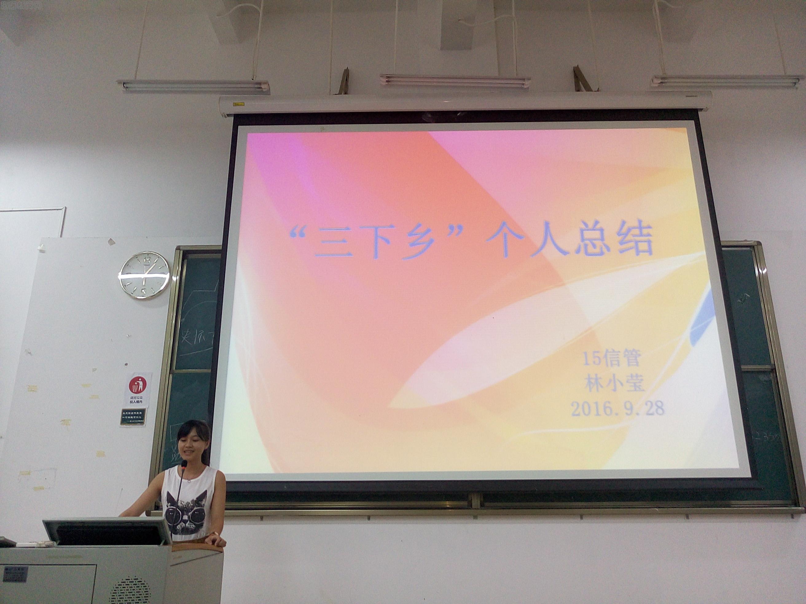 会议首先由大四、大三、大二的王世丽和潘雯、王翠灵和岑佳宜、邓大略和林小莹等同学按照班级和个人的情况分别进行了汇报。她们依次通过精美PPT总结了此次“三下乡”社会实践活动的基本情况,并相互交流了经验与收获。接着王鹏老师就全院暑期三下乡情况进行了整体的汇报与交流,针对极少数同学没有按时报送心得体会等情况,他通过说明“细微小事,往往是一个人塑造人格和诚信积累的关键”,希望同学们养成一个良好的习惯,“为自己负责,对别人尊重”。