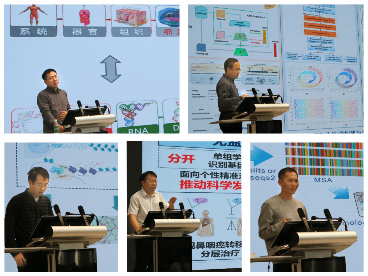 赵方庆研究员分享了最新利用单细胞及空间多组学技术在临床病例特征的技术与应用;尤著宏教授介绍了与其团队利用生物医学知识构建了多种生物网络图谱(蛋白质分子网络,药物-药物互作网络,基因-疾病网络等),将生物小分子嵌入网络并进行分析的过程;张勇教授介绍了通过构建染色质基础模型来解析转录组中调控因子互作的最新进展;蔡宏民教授重点讲授了无监督聚类方法在基因、细胞以及组织结构中的应用与挑战;杨建益教授讨论了RNA结构预测面临的挑战,并提出了基于AI建立高精度的RNA结构预测方法。