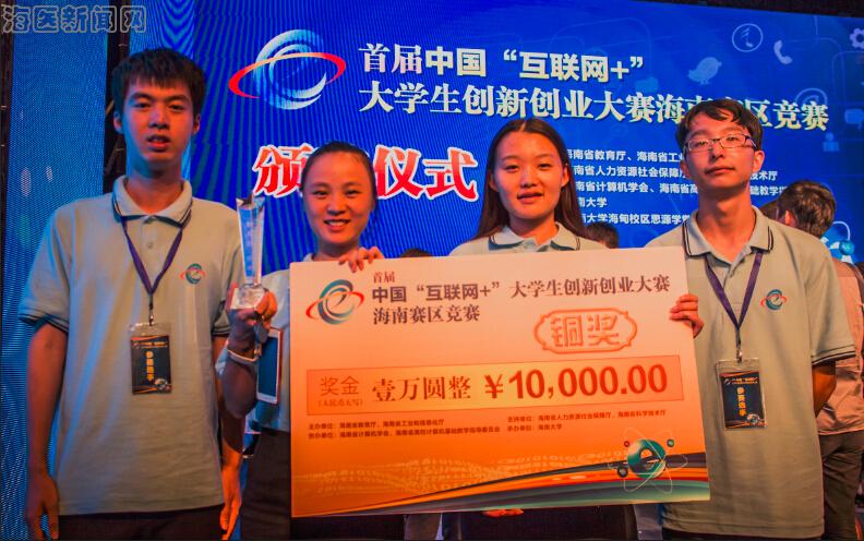 在海南赛区比赛中,代表海南医学院参赛的信息技术部(医学信息系)《会所话的二维码》创新团队成员佘陈凤、刘迪、曹友和石荣辉等人,在指导老师余远波的精心指导下,经过紧张的赛前准备和激烈的比拼,在众多的大学生创新创业项目中脱颖而出,获得了大赛评委的好评。最终《会所话的二维码》项目夺得创意组铜奖、奖金10000元。