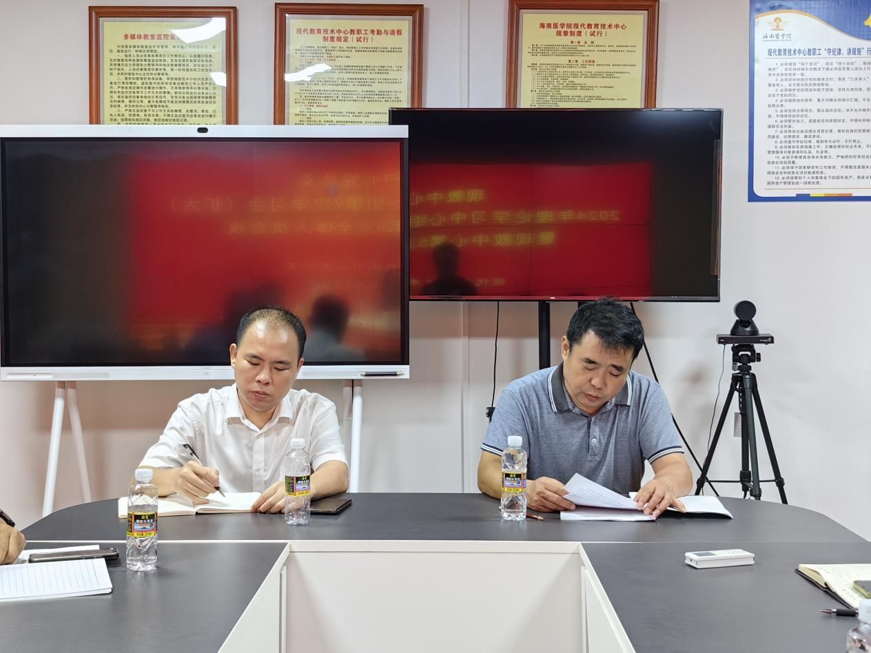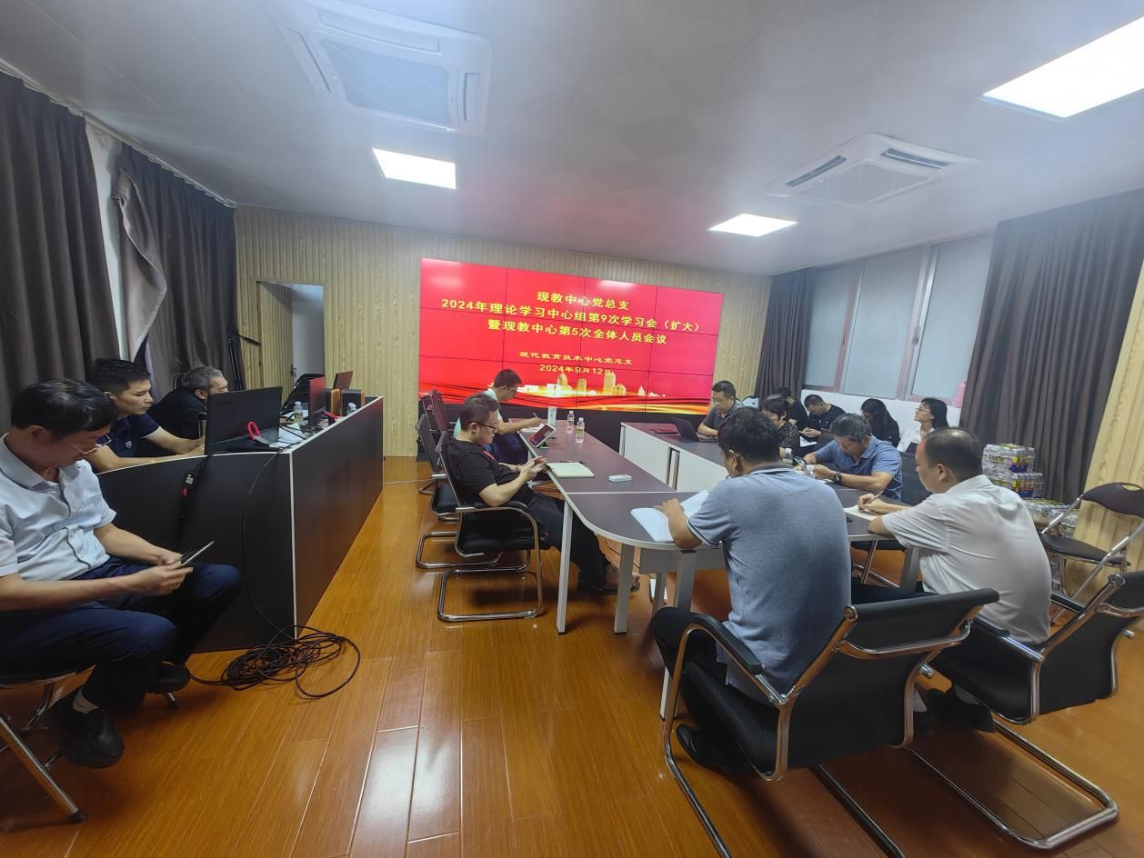 2024 年 9 月 12 日,现代教育技术中心党总支在润深楼北楼 606 教学监控室召开了现代教育技术中心党总支 2024 年理论学习中心组第 9 次学习(扩大)会议暨现教中心第 5 次全体人员会议。会议由党总支书记李春报主持,黄斌文主任、张经能副主任以及中心全体人员参加。