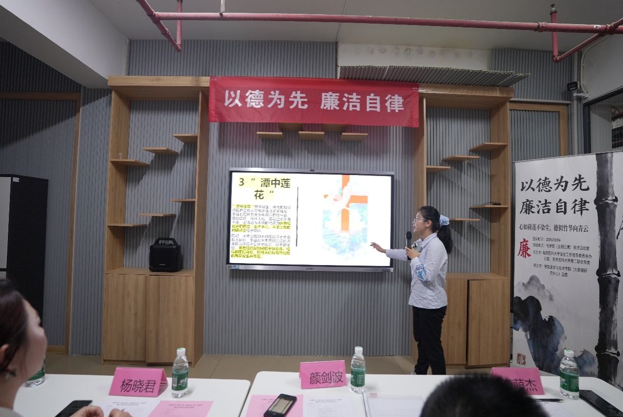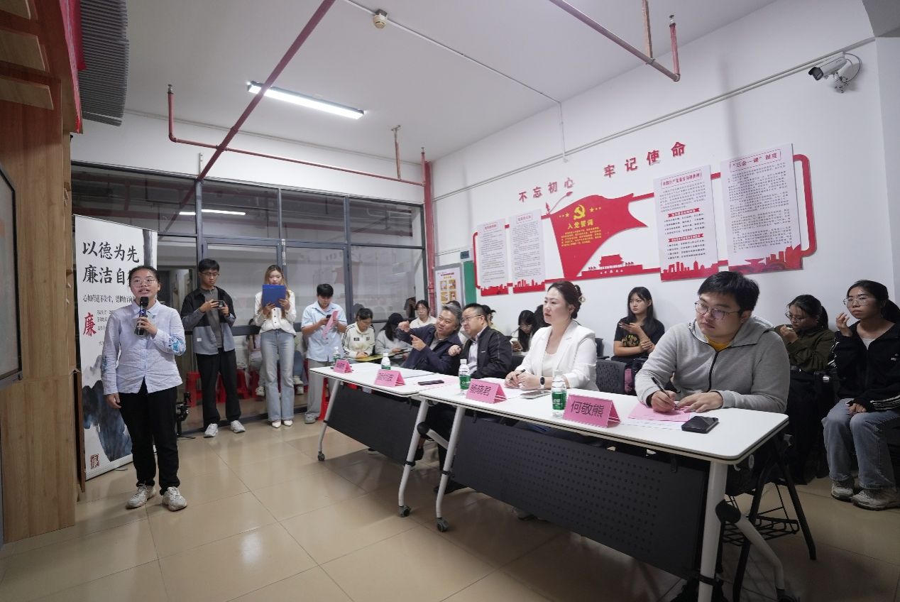 决赛答辩会场设立在“一站式”学生社区党团活动室。与想象中的紧张严肃不同,现场更像是一场围绕“廉洁”的交流会。纪检监察二处颜剑波副处长,校团委杨晓君副书记,学生工作指导委员会办公室何敬熊副主任,第二联合党委李萌杰副书记等也在百忙之中到场支持。进入决赛的同学们轮流上台,通过PPT、视频等方式,详细介绍自己作品的创作灵感、构思过程,并分享他们对“廉洁”的理解和体会。