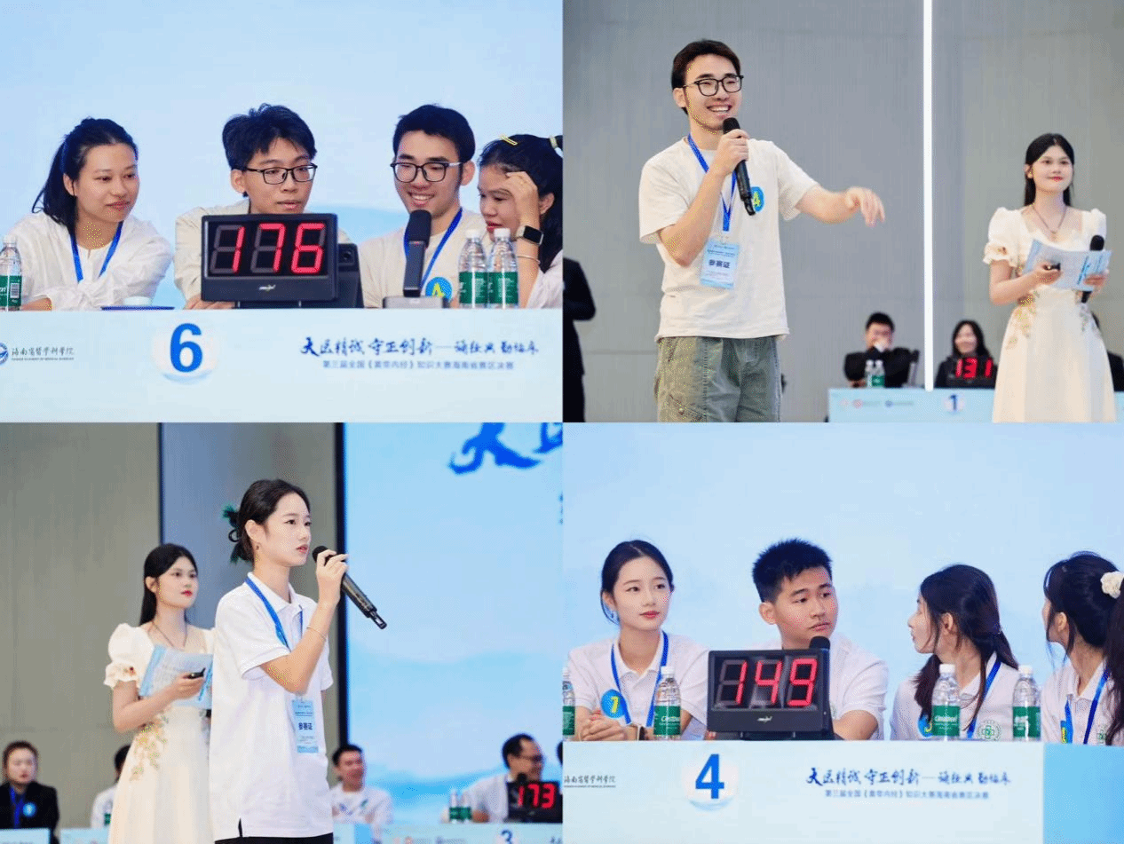 本次决赛题型设计兼具专业性、趣味性与观赏性,设有必答题、抢答题、风险题和拓展题四大板块,全面考察选手对《黄帝内经》条文的记忆精度、理解深度与临床运用能力。赛场上,各参赛队伍沉着冷静、思维敏捷,展现出扎实的经典功底与良好的竞技风貌。拓展猜词环节妙趣横生,选手们精准解读中医核心概念,默契配合间尽显团队智慧;抢答环节紧张激烈,选手们反应迅速、果断出击,台上比分交替攀升,台下掌声雷动,将比赛一次次推向高潮。整场赛事节奏紧凑、亮点纷呈,选手们在切磋中求真知,在竞答中悟医道,共同绘就了一幅“传承经典、思维闪耀”的生动画卷.